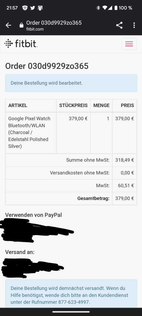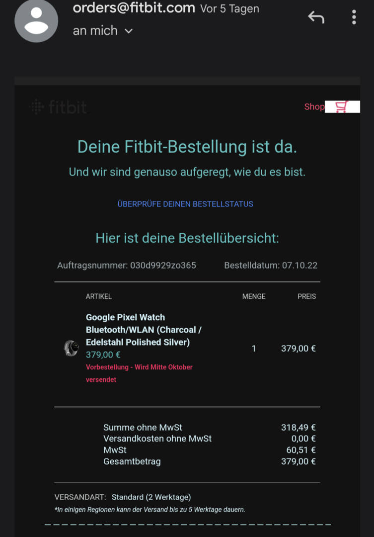 Hallo liebe Google Fans, habe am 6.10 bei Fitbit auf deren Website Bestellt und warte immer noch auf die Lieferung.