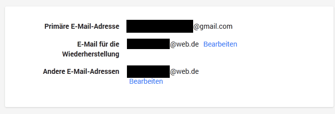 Die Primäre war früher ebenfals eine @web.de Mail, welche wohl im Zuge einiger Umstrukturierungen über die Jahre einfach eine @Gmail.com wurde. Die Email bei "Andere E-Mail-Adressen" habe ich erst vor nem halben Jahr hinzugefügt, und genau da kann man weitere Emails hinzufügen. Nur eben keine GMail-Adressen
