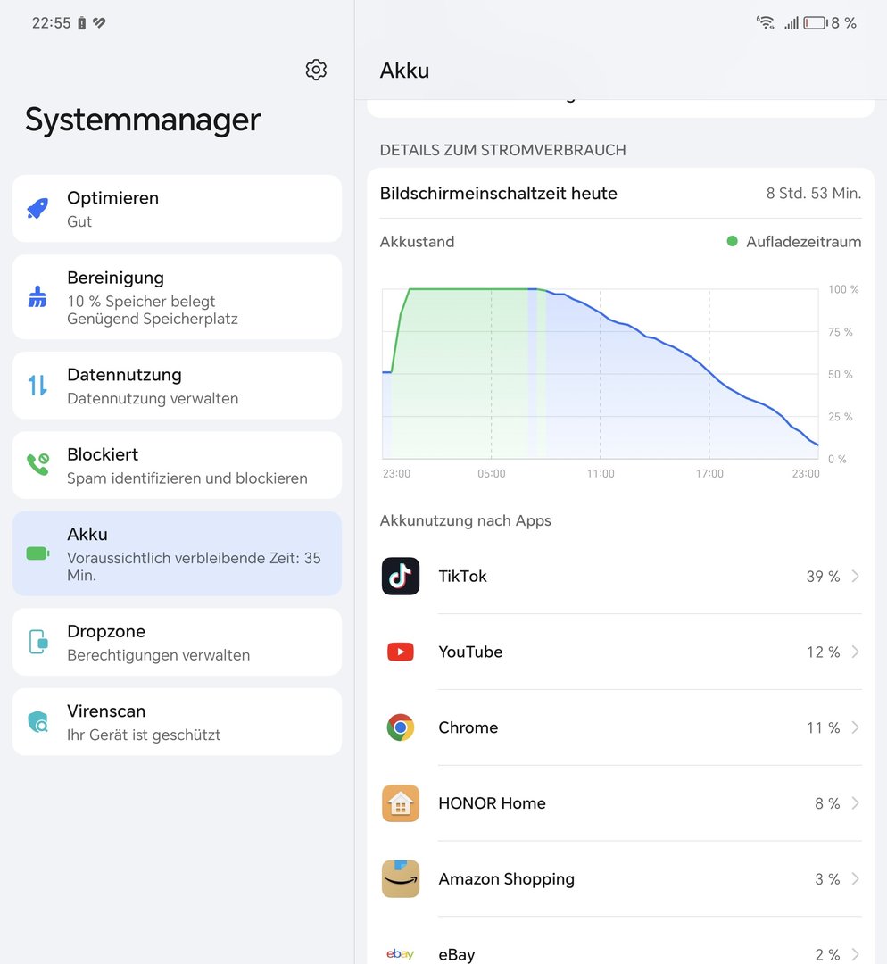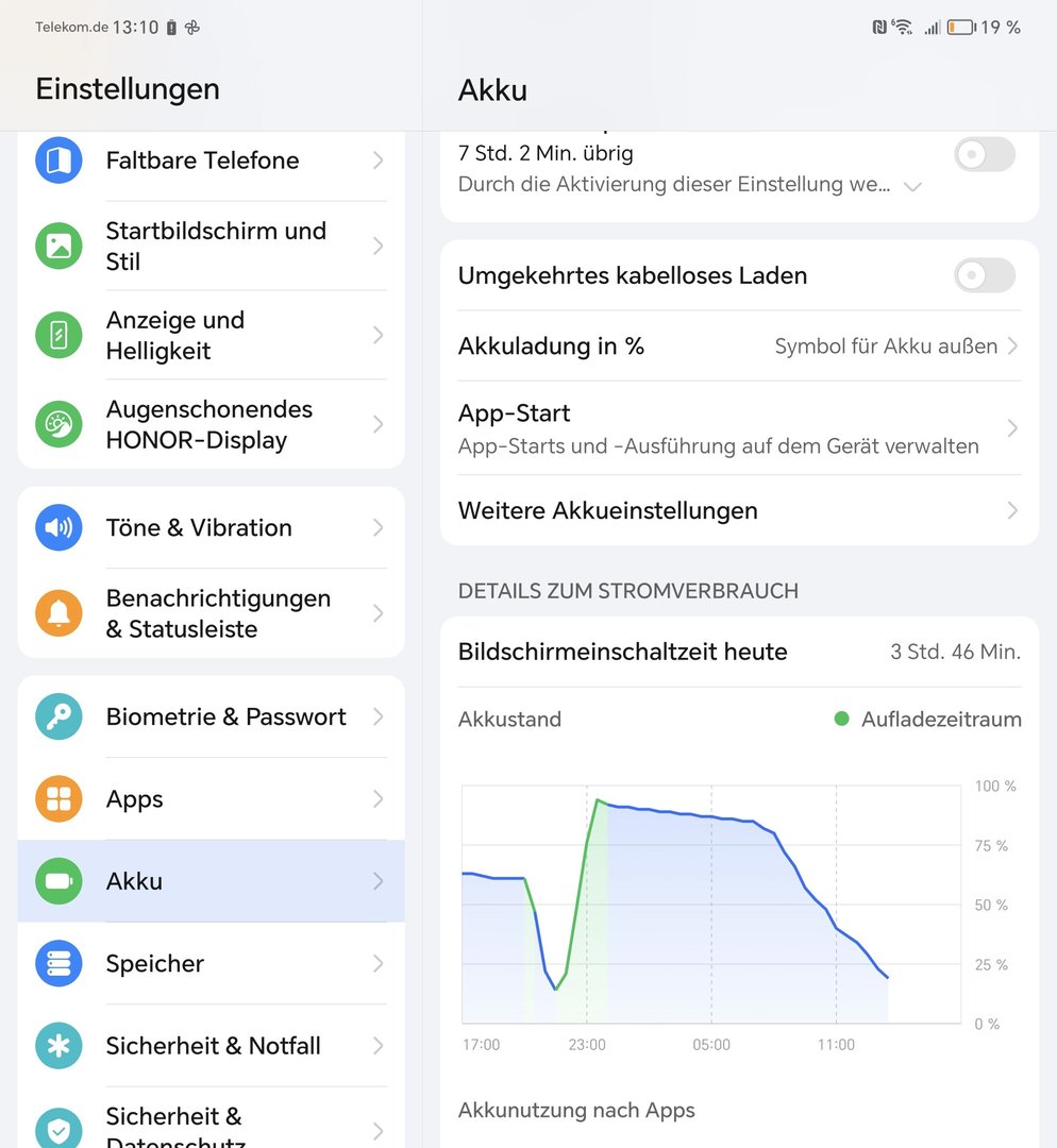 Subjektiv habe ich das Gefühl, dass der Akku zwar keine Rekorde aufstellt, das Gerät aber im gemischten Betrieb gut durchhält. Das Display habe ich auch auf 120Hz eingestellt.