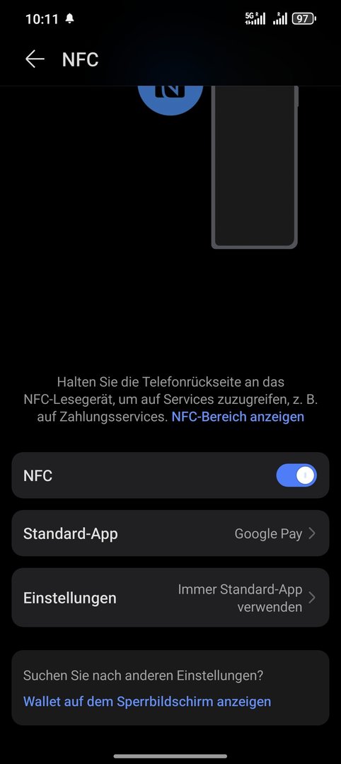 Wenn ich jetzt in den Einstellungen nach NFC suche, kann ich NFC aktivieren/deaktivieren aber als Standard App ist eine meiner SIM Karten aktiv??? Das kann ich auch nicht ändern.