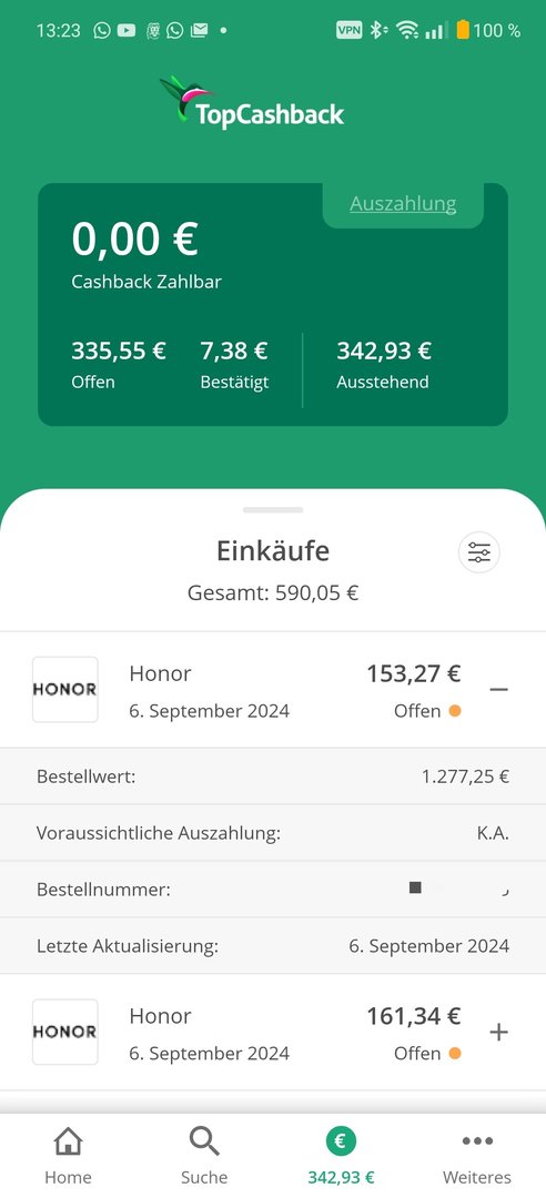 Honor-APP und 12% Topcashback gehen bei Dir. Bei mir steht, dass TOPCASHBACK nur im Browser funktioniert und nicht in der app.Android-in schrieb:Wenn man kein CB hat: