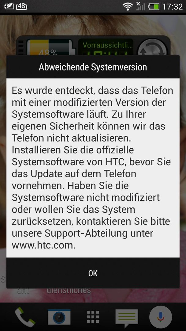 Beim installieren des Updates 4.18.401.4 erhalte ich nach dem runter Laden die Meldung : Abweichende Systemsoftware: Es wurde endeckt das das Telefon mit einer modifizierten Version der Systemsoftware läuft. Update also nicht möglich, ich soll die offiziele Systemsoftware von HTC installieren.