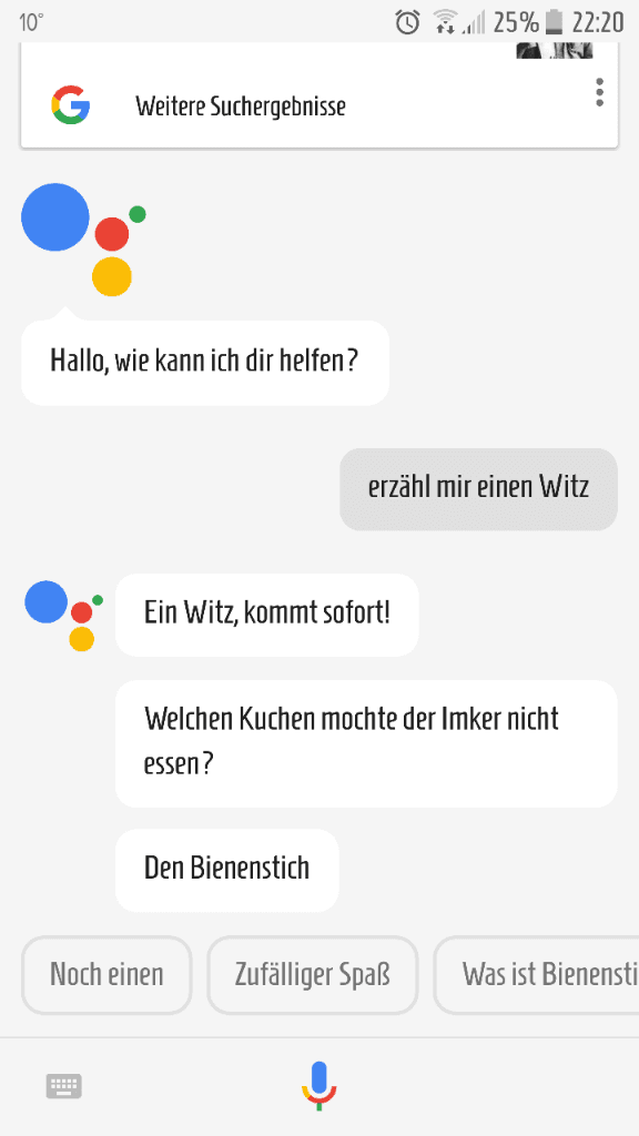 Auf meinem HTC 8 erzählt er mir auch einen Witz.kalli73 schrieb:Das liegt aber nicht unbedingt am U11. Hab es gerade ausprobiert und mir hat der Assistant nen Witz erzählt auf dem HTC 10 [emoji6]