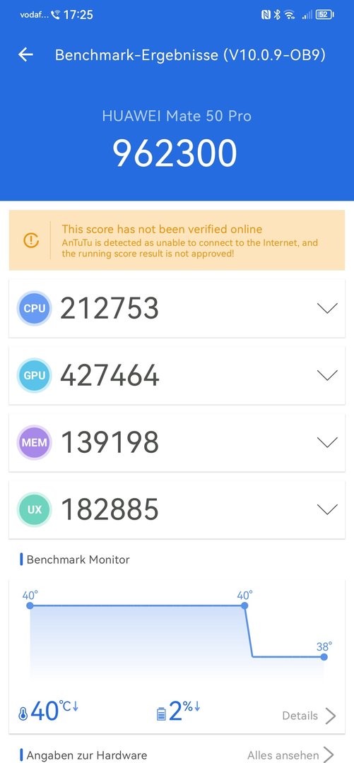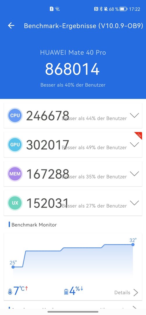 Wenn man bedenkt, dass Mate 40 pro ein 2020er Modell ist, dann ist das schon erstaunlich. Meiner Meinung nach muß sich das Gerät hinter keinem aktuellen Flagship verstecken. Klar wer nur auf absolute Benchmarkwerte steht, wird das anders sehen, aber ich habe noch kein Szenario gehabt bei dem ich die Leistung ausgereizt habe.
