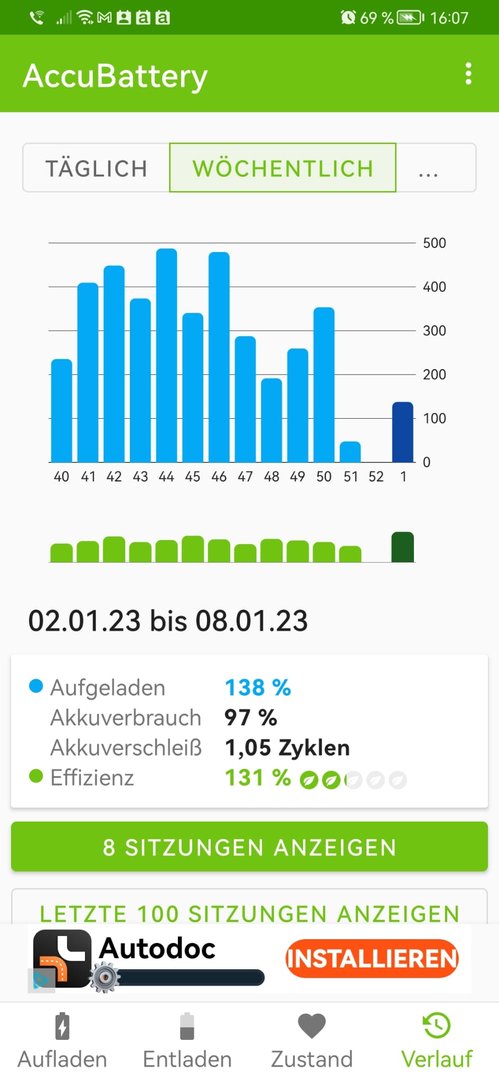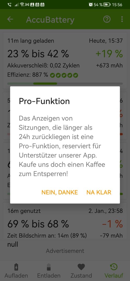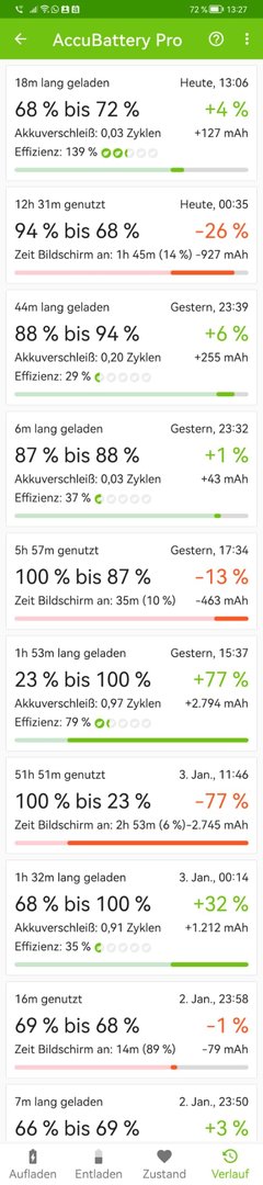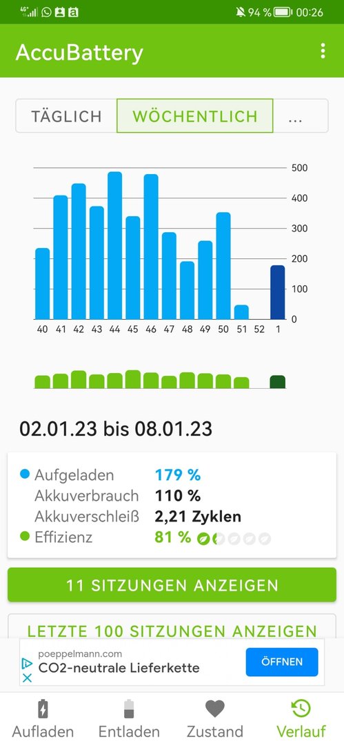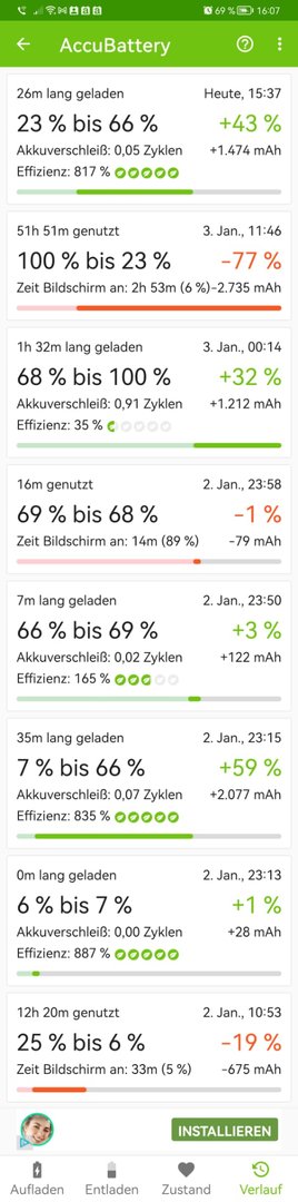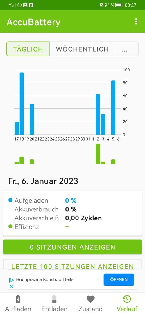 Ich bekomme jeweils wunderbare Infos, was und welche App wieviel Strom verbraucht und wie lang ich noch hinkomme aber mich interessiert momentan vorrangig , wann genau (Tag) der Akku das letzte Mal an meinem Ladegerät war um daraus eine Tendenz für einen möglicherweise neuen Akku zu entwickeln (oder eben nicht) denn eigentlich bin ich schwer zufrieden mit dem Akku aber das Huawei Angebot läuft ja noch ein paar Tage.