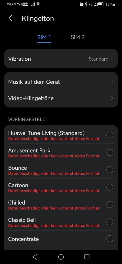 Wenn ich in den Einstellungen einen Sound auswählen möchte, kommt die Fehlermeldung, dass die Datei beschädigt sei, oder das Format nicht unterstützt wird.