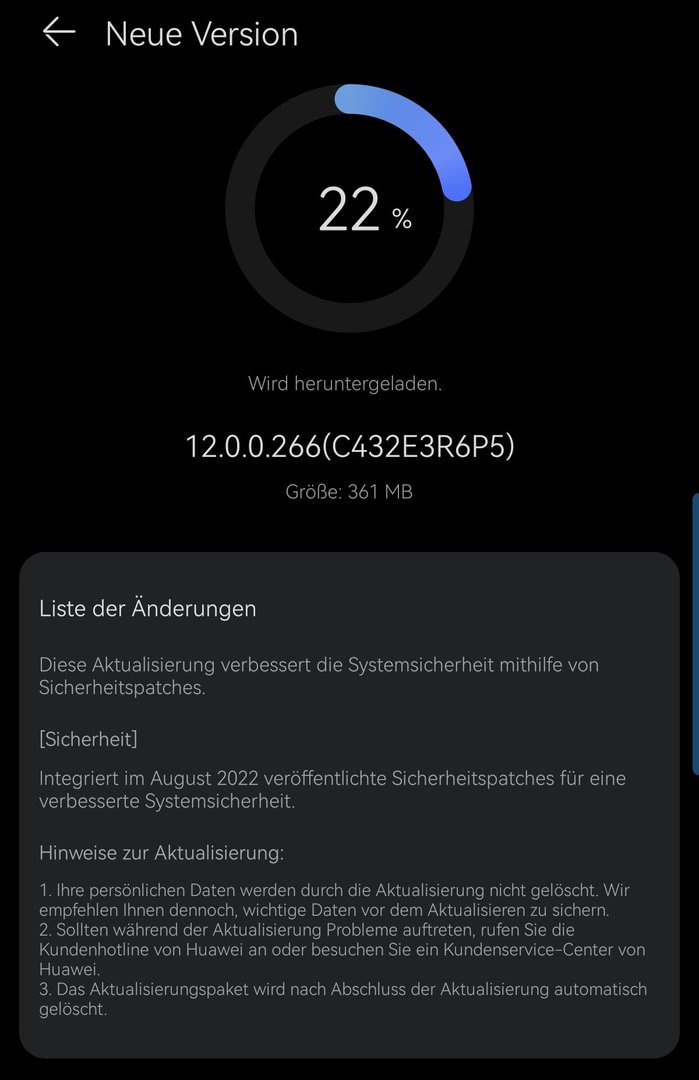 TheMissingLink Ehrenmitglied 26.121 #1 Neues Update 12.0.0.266 eben gerade hier aufgeschlagen. Sicherheitspatch August. Größe etwa 380mb Anhänge Screenshot_20220824_223741_com.huawei.android.hwouc_edit_262351795664134.jpg 165,4 KB · Aufrufe: 132