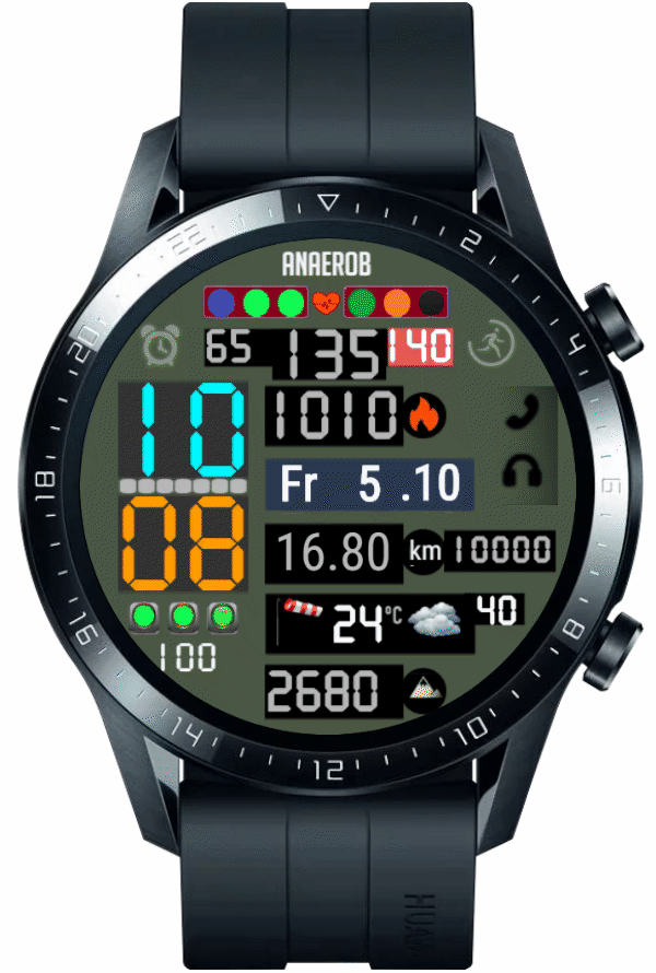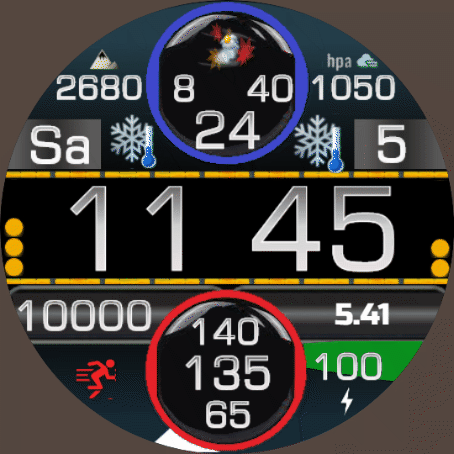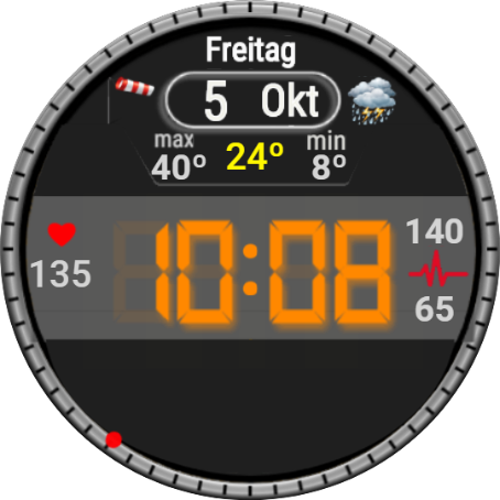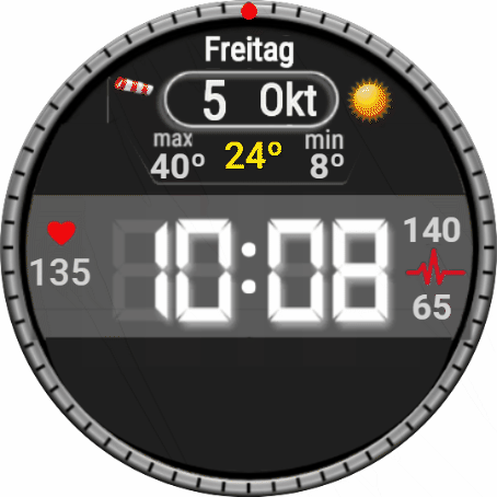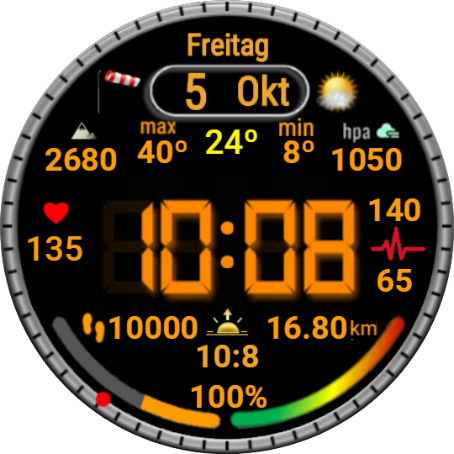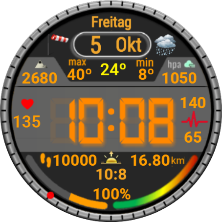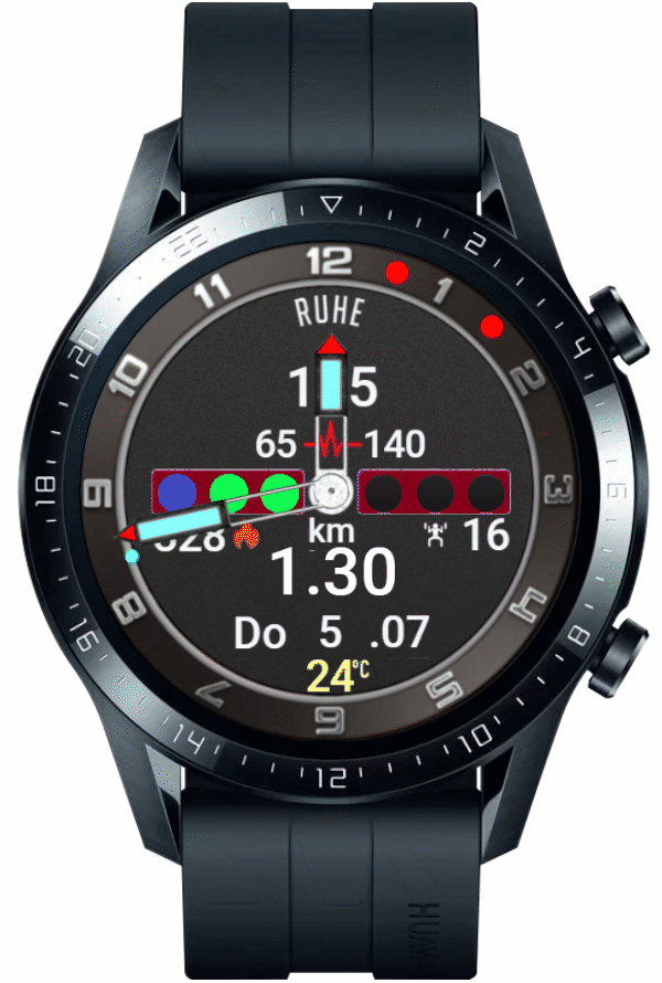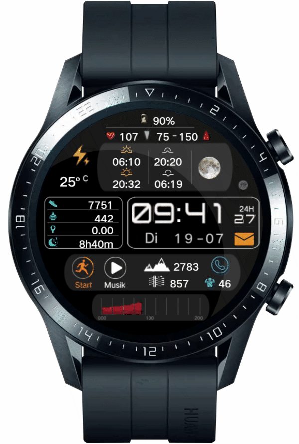 Datum/WT - Schlaf, Akku - Workout, 00 - Höhe, 10 - Kompass, 20 - Stoppuhr, 30 - Wecker, 40 - Timer, 50 - Musik