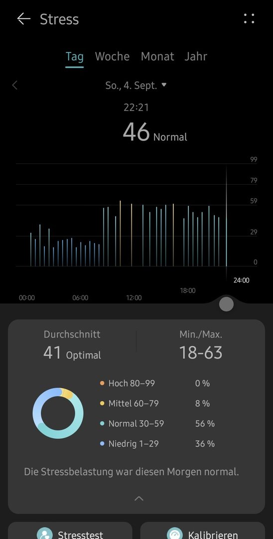 Bei Garmin hatte ich einen Durchschnitt zwischen 35 und 40, tagsüber ist der Balken bei mir auch mal ganz nach oben gegangen, wenn es beruflich stressig war. Auch wenn ich die Höhe nicht immer genauso gefühlt habe, war der Stress nachvollziehbar.