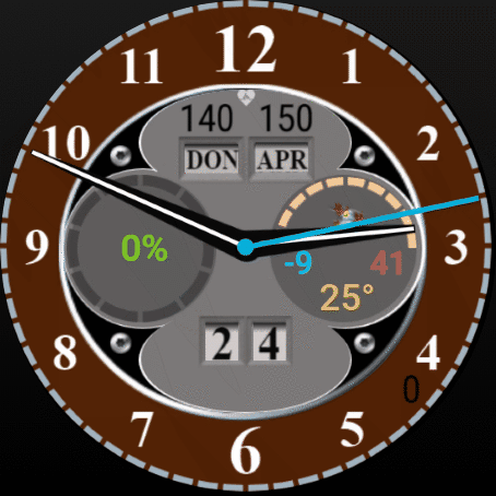 Zahnrad - Wetter an/aus, Monat/11/12Uhr - an/aus, 8Uhr - Wahlmöglichkeit 4x Zifferblatt (über Datum -widget)