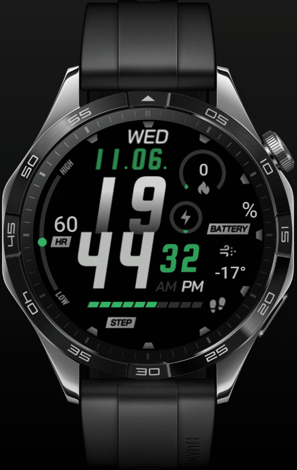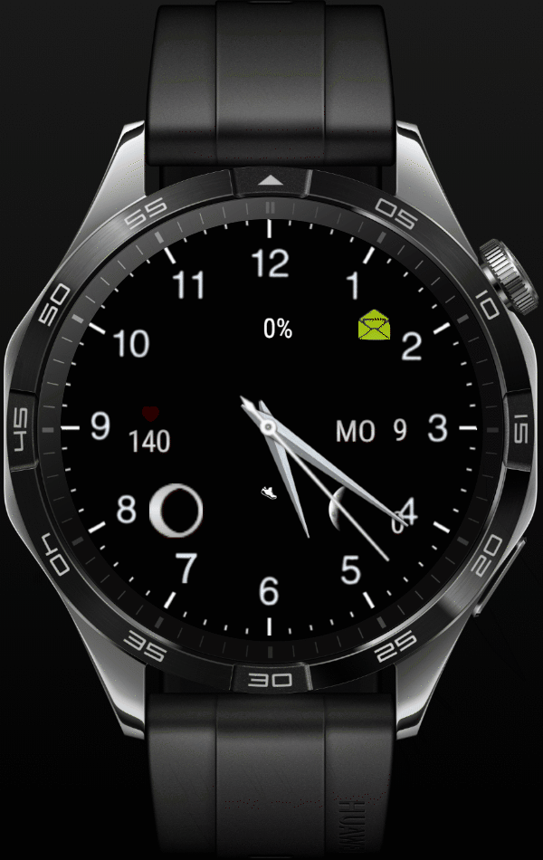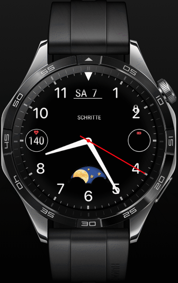 analogen Zeigern, Mondphase, Schrittzähler und Puls