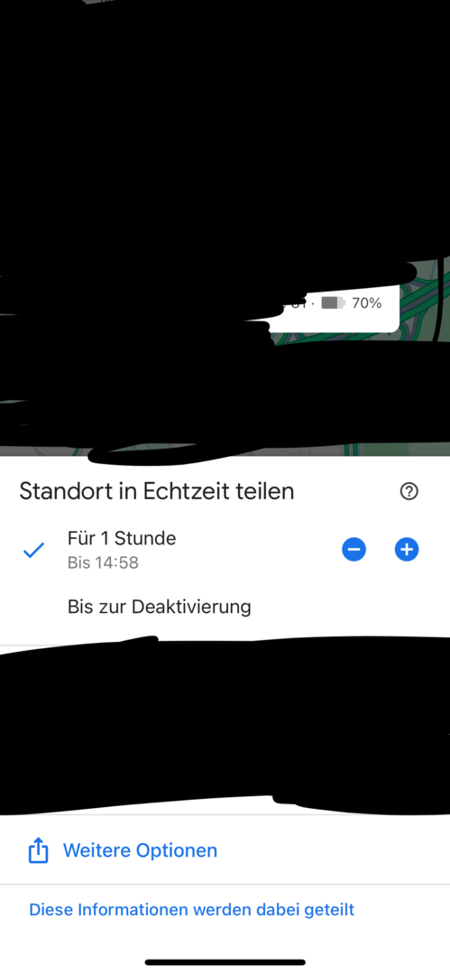 Hallo! Vielleicht kann mir jemand helfen. Wir benutzen ein iPhone 14, aktuellster Stand und ein Android-Gerät, ein Gigaset GS5. Bisher haben wir über Google Maps die Standortverfolgung benutzt. Man kann also sehen, wo sich der Andere gerade befindet. Beide Geräte waren auf "ohne Zeitbegrenzung" eingestellt. Seit kurzem funktioniert das auf dem iPhone nicht mehr. Es wird nur noch ein Zeitraum von 1, 3 oder 24 Stunden angegeben. Hat jemand eine Idee, wie man den vorherigen Zustand ohne Zeitbegrenzung wieder herstellen kann? Ich habe trotz langer Suche leider nichts gefunden. In umgekehrter Reihenfolge funktioniert es übrigens.