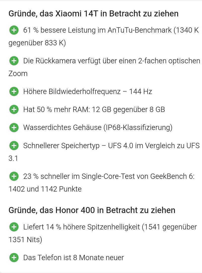 Guten Abend in die Runde, ich bin völlig überfordert und brauche Hilfe. Ich könnte mir ein neues Smartphone aussuchen,da kommen einmal das Honor 400 und das Xiaomi 14t pro in Frage. Könnte beide sehr günstig erwerben. Welches ist da für Fotos besser,die sind mir am wichtigsten?