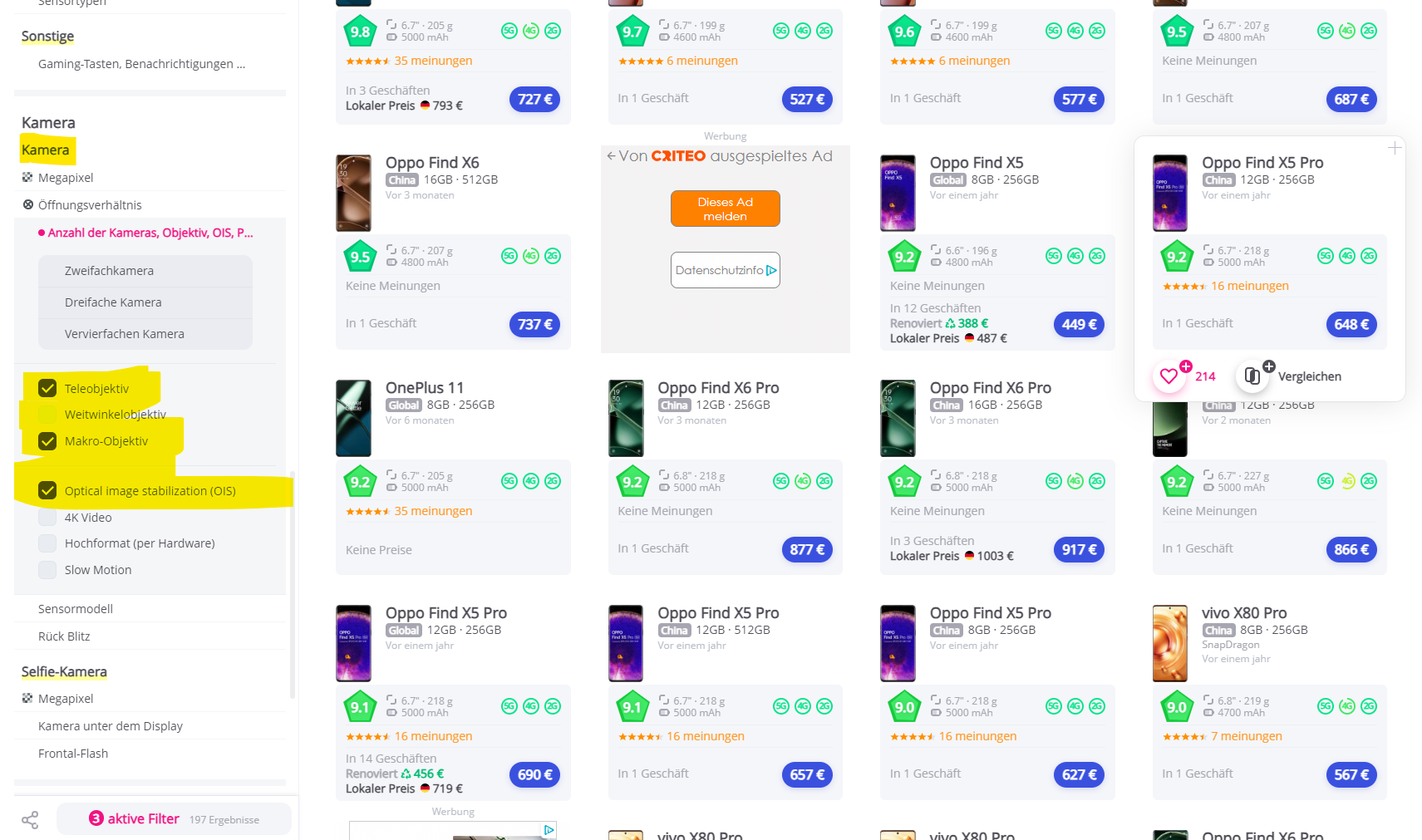 Letztere Begriffe habe ich deinem Beitrag entnommen, ist "Tele" irgend ein standarisierter übergreifender Begriff für das optische zoomen? Genauso OIS für Bildstabilisator? Kann man die Begriffe irgendwo in Handysuchen eingeben und findet dann alle die das haben? Ich habe mich damit schon auf der kimovil-Seite auseinandergesetzt, aber bin mir nicht sicher ob es vergleichbare Funktionen unter anderen Begriffen gibt.