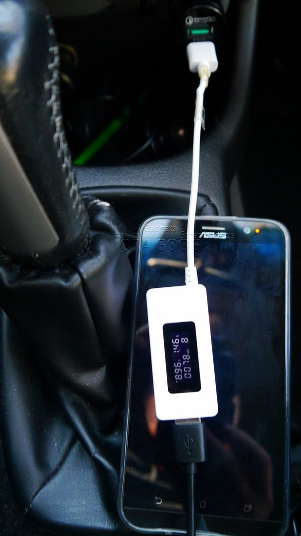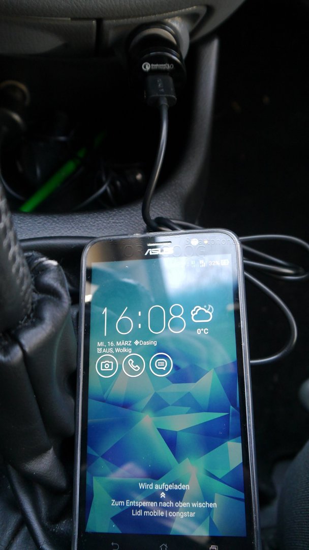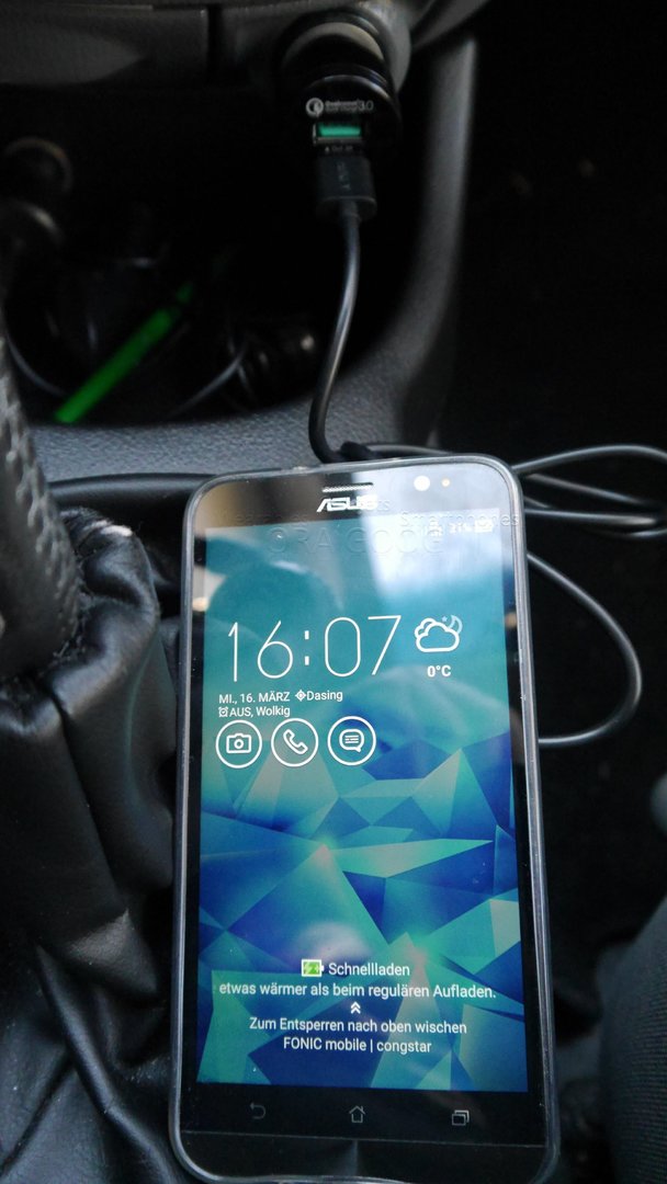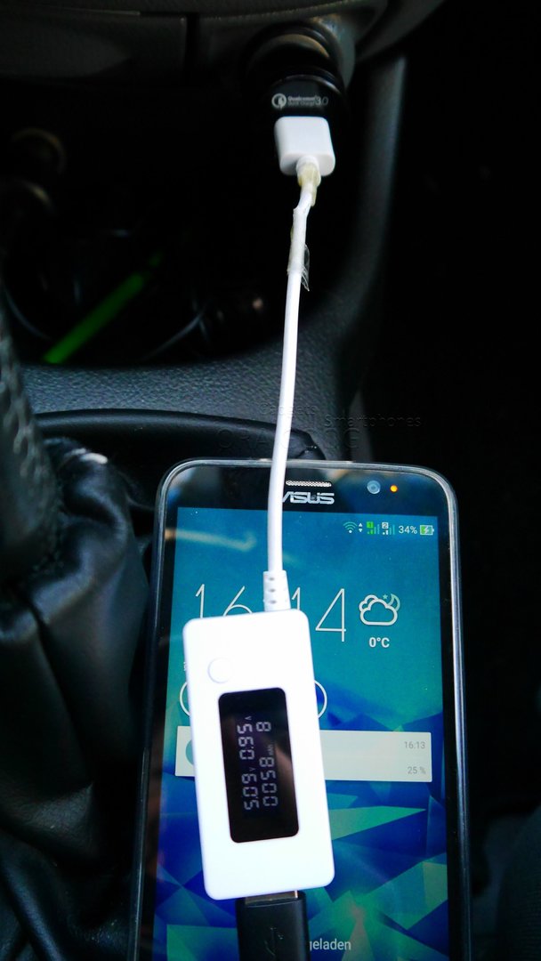Einmal mit mehr als 5V unter Verwendung der QC 3.0 Technologie. Geladen wurde ein QC fähiges Handy (AUSUS zenFone 2) am QC 3.0 Ausgang. Das Handy erkennt den QC 3.0 Anschluss.