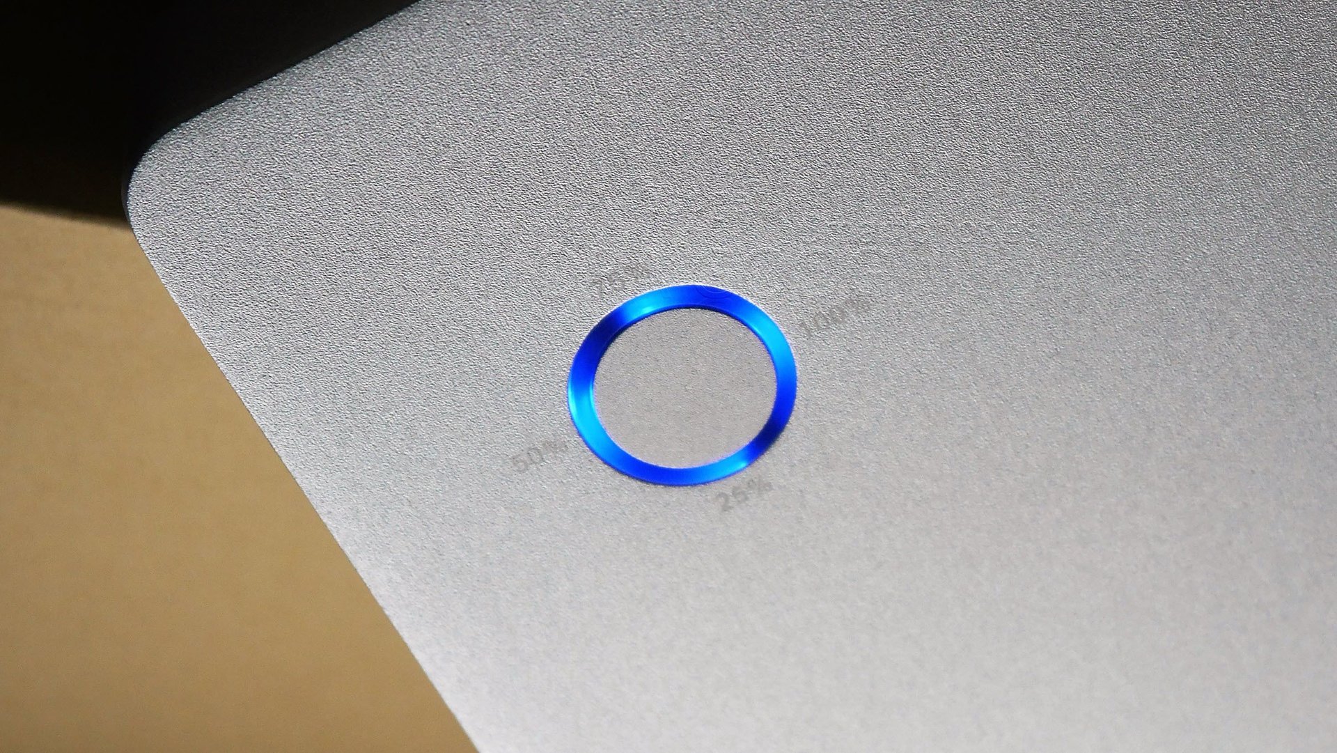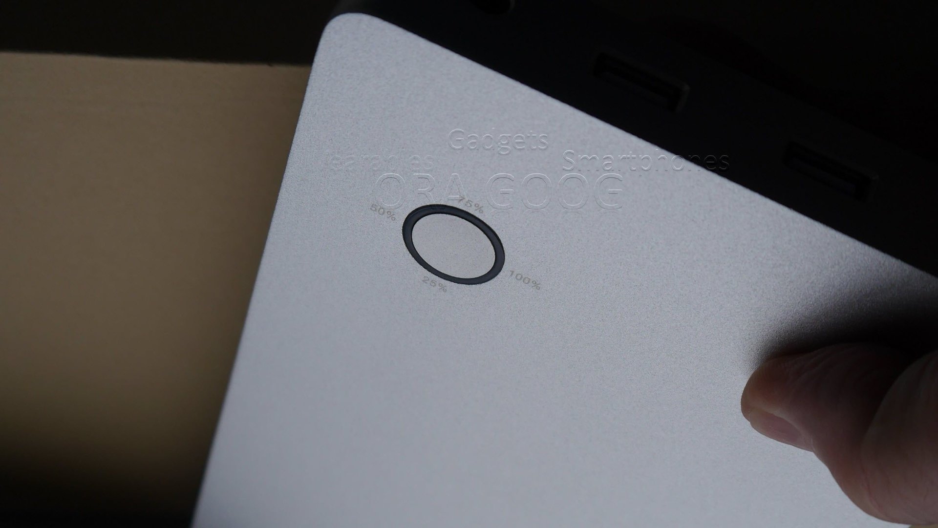 Der runde LED Indikator um den Taster zeigt den Ladezustand der Box an (0, 25, 50, 75, 100%).
