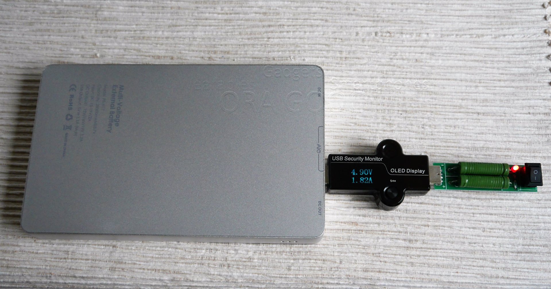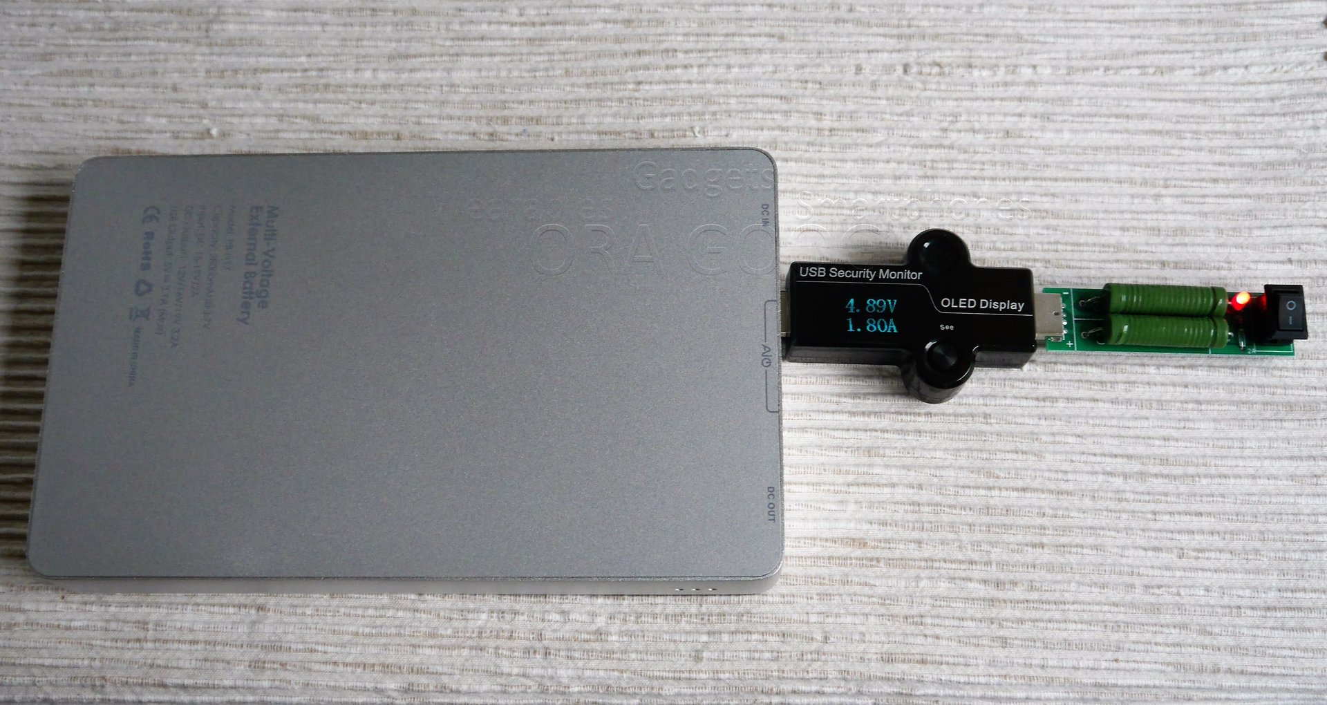 Ausgemessen habe ich beide USB Ladeausgänge bezüglich des zu entnehmenden Stroms. der angeschlossene Entladewiderstand hätte eigentlich an 5V 2A fließen lassen sollen. Beide Ausgänge lieferten aber nur knapp 5V (siehe Foto).