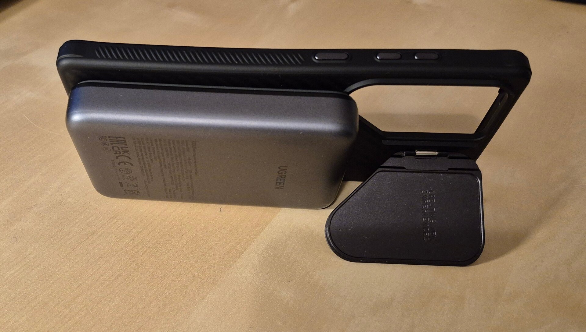 - Nillkin Hülle in schwarz, kevlar-Optik, mit Kamera-Schutz aus Metall. Den Kameraschutz kann man ausklappen, um das Handy auf einem Tisch aufzustellen, zum Beispiel zum Video schauen. Die Hülle hat auch einen Magsafe-Magneten. Auf dem einen Bild habe ich eine Powerbank an den Magneten gehängt, die Powerbank wird aber nicht mit verkauft ;-)