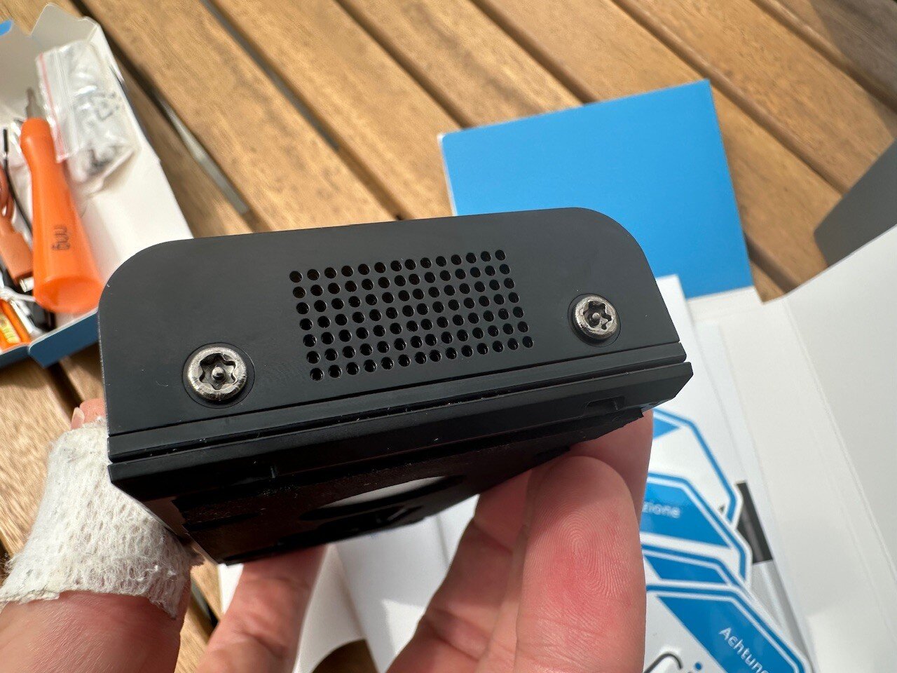 Am Alu sind keine Spuren zu sehen, lediglich am oberen schwarzen Rand sind man noch die Spuren von der Befestigung an der Tür. Das war eine Kombination aus Klebeband und Kabelbinder. Aber dieser schwarz glänzende Kunststoff ist allgemein sehr anfällig für Kratzer und Spuren.