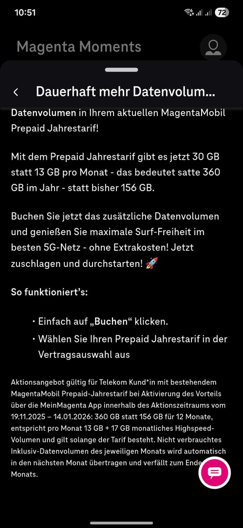 .Ist da schon bekannt wie viel? Nicht dass ich mehr bräuchte, ich habe meine eigene Challenge laufen immer nur das Datenvolumen vom vorherigen Zeitraum zu verbrauchen. Da wäre mehr Puffer gutKa-ribik schrieb:Für Monatstarife soll das wohl ab Morgen 11 Uhr in der App im Rahmen der Magenta Black Days möglich sein.