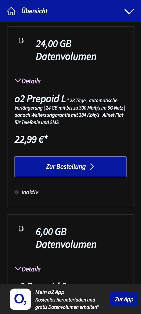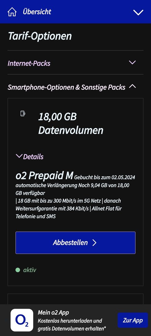 Der Tarif O2 Prepaid S bietet ab Mai 2024 ein Datenvolumen von 8 statt 6 GByte, die Gebühr für vier Wochen sinkt von 12,99 auf 9,99 Euro. Beim Tarif M surfen Nutzer in Kürze mit 15 statt 12 GByte, der Preis für vier Wochen sinkt von 17,99 auf 14,99 Euro.