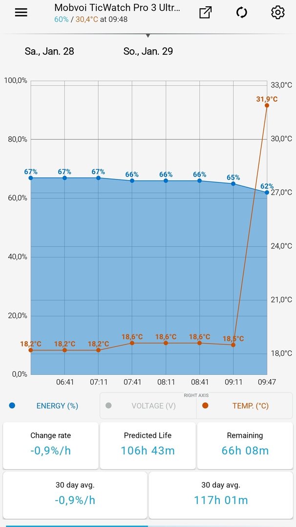 Update nach 12h:Romulix schrieb:Aus heiteren Himmel, ohne irgend etwas geändert zu haben an der SmartWatch,keine neuen Apps oder sonst irgend etwas rattert die Akkuanzeige herunter.