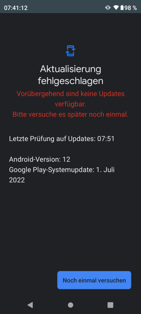 Hallo, ich habe 2 baugleiche Handys moto g71 5g - auf einem der beiden kann ich nicht nach dem Google-Play-System-Update suchen (siehe Screenshot), auf dem anderen ist alles okay.