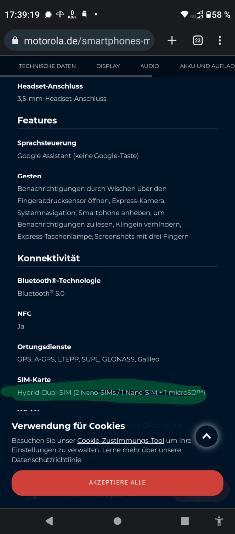 Ich habe das moto g42, welches die Steckplätze für 2 Sim-Karten UND noch eine SD-Karte hat.