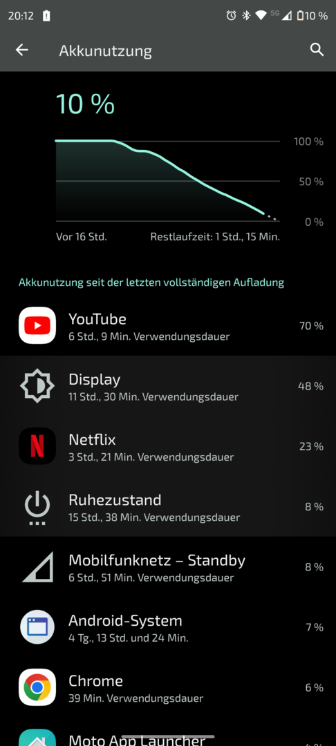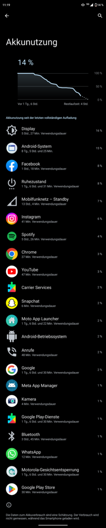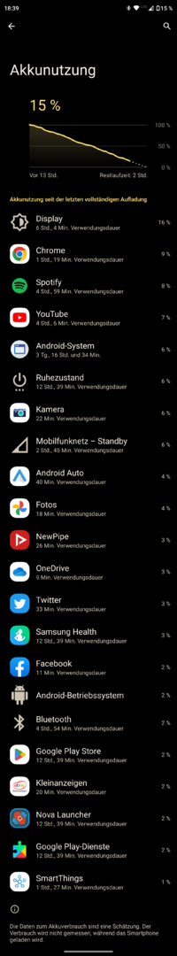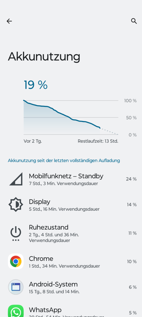 Nach einem initialen Aufladen auf 100% liegt der Akkuverbruch bei Nichtbenutzung, aber eingeloggt ins Mobilfunknetz, WLAN und alle Apps "dürfen werkeln" bei ca. 2% innerhalb von 4h.