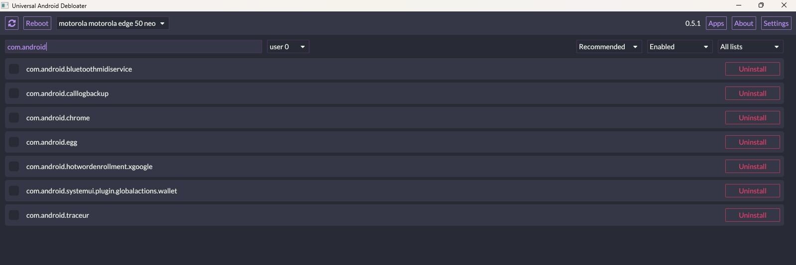uninstall via ADB bringt einen internen Fehler, gefundene APKs kann ich leider nicht installieren.