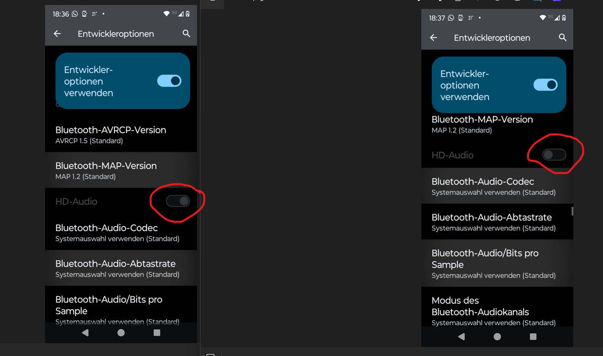 Vielleicht muss zuvor Bluetooth aktiviert worden sein?mibi007 schrieb:Wenn ich aber wieder aus den Entwickleroptionen rausgehe und gleich wieder rein, ist der Schalter bei HD Audio wieder deaktiviert. Warum ist das so?
