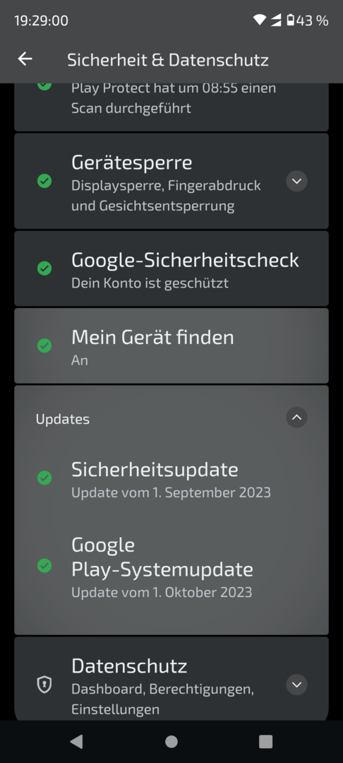 google-play ist bei mir bei 1. oktober 2023lwittgenstein schrieb:Play System Updates kamen schon mehrere, aber immer noch Stand 1. September.
