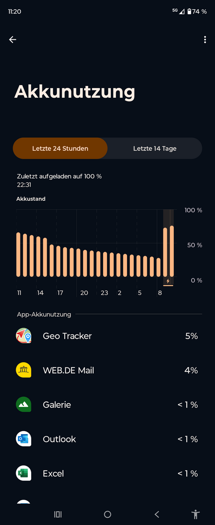 Wir beziehen uns auf die Ausgangssituation im oben genannten Punkt 1 – Start des Alltags um 06.00 Uhr morgens bei 91%. 12 Stunden später um 18.00 Uhr abends betrug die Akkukapazität noch 73%. Das Gerät war den gesamten Tag über im T-Mobile 5G Mobilfunknetz eingebucht, genutzt wurde gelegentlich die Kamera, Messenger, Mail und die Telefonfunktion. Darüber hinaus war das Gerät meistens zugeklappt und das AoD auch tatsächlich dauerhaft in Betrieb. In Anbetracht dessen ist ein Akkuverbrauch von knapp 20% in 12 Stunden in Ordnung, das RAZR 50 Ultra hatte in etwa dieselben Werte. De facto bedeutet dies, dass man mit dem Gerät einen vollen Arbeitstag locker übersteht, auch wenn vielleicht die ein oder andere Multimedia-Anwendung etwas intensiver genutzt wird. Man sollte sich allerdings von der Illusion lösen, effektiv mehr als einen Tag Nutzungszeit rausholen zu können – zumindest ein voller zweiter Tag dürfte wohl kaum möglich sein, ohne das Nutzungsverhalten dann rapide einzuschränken.