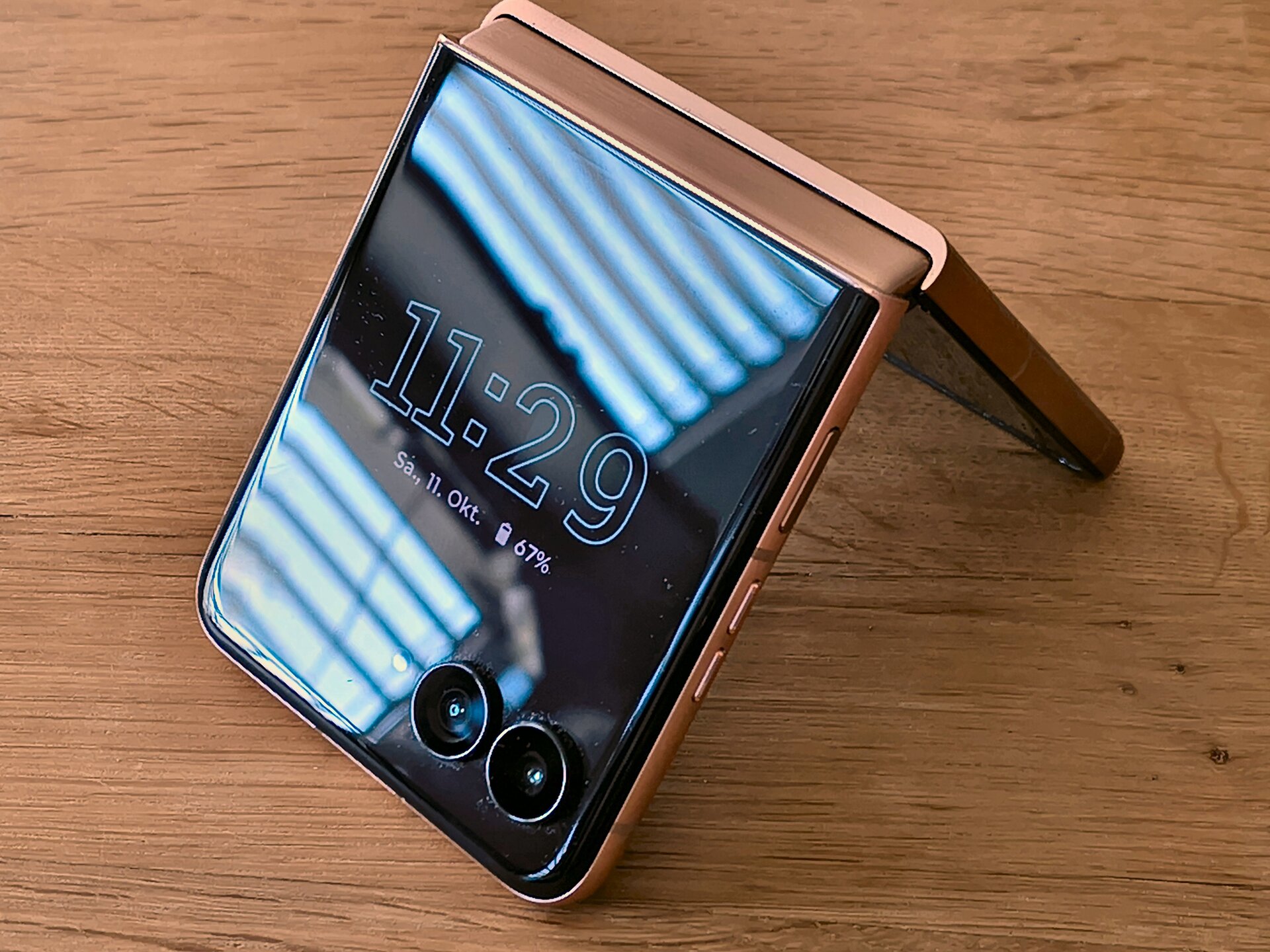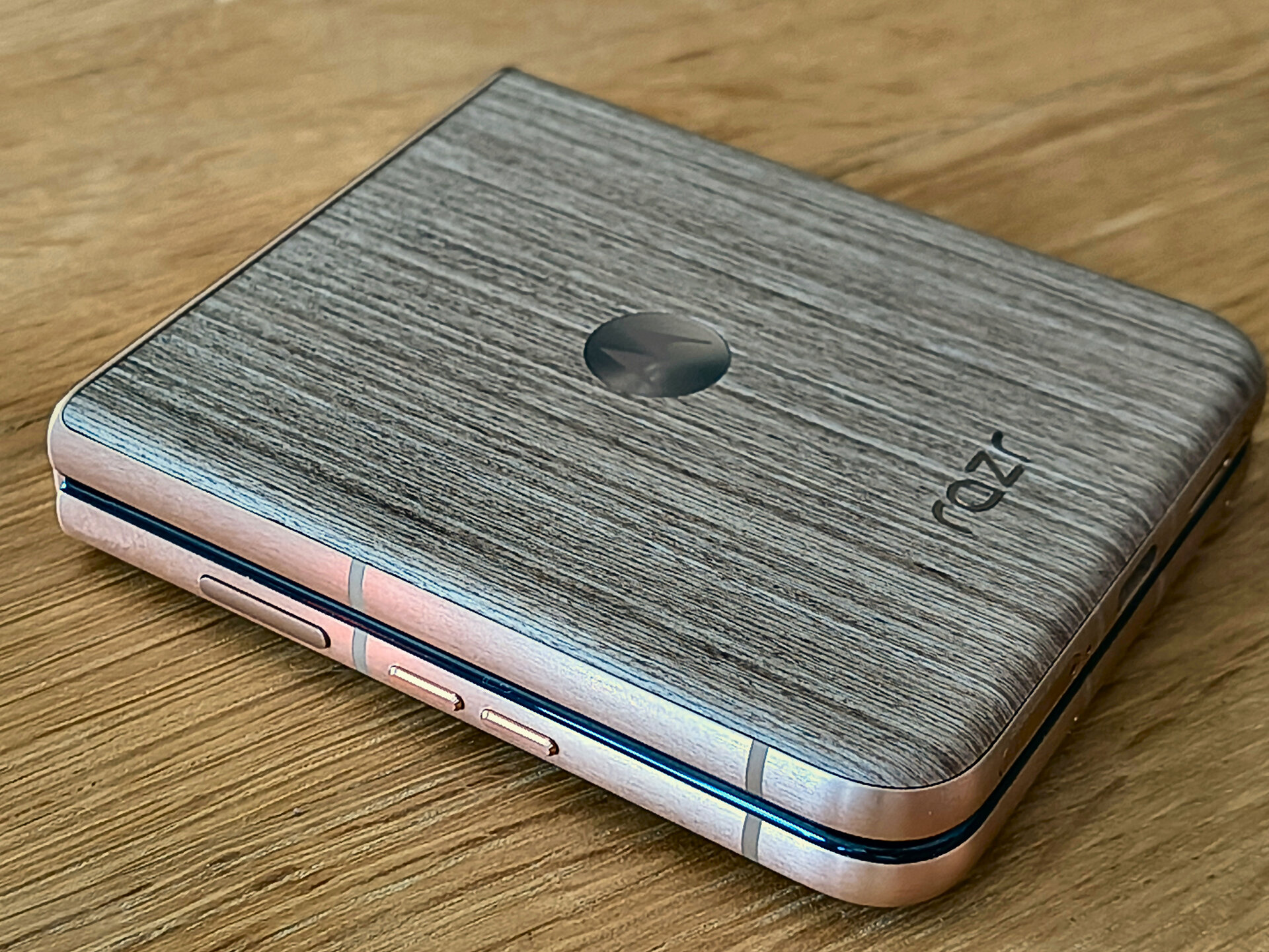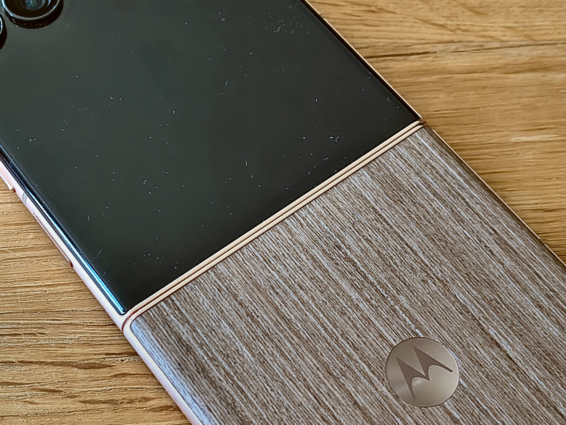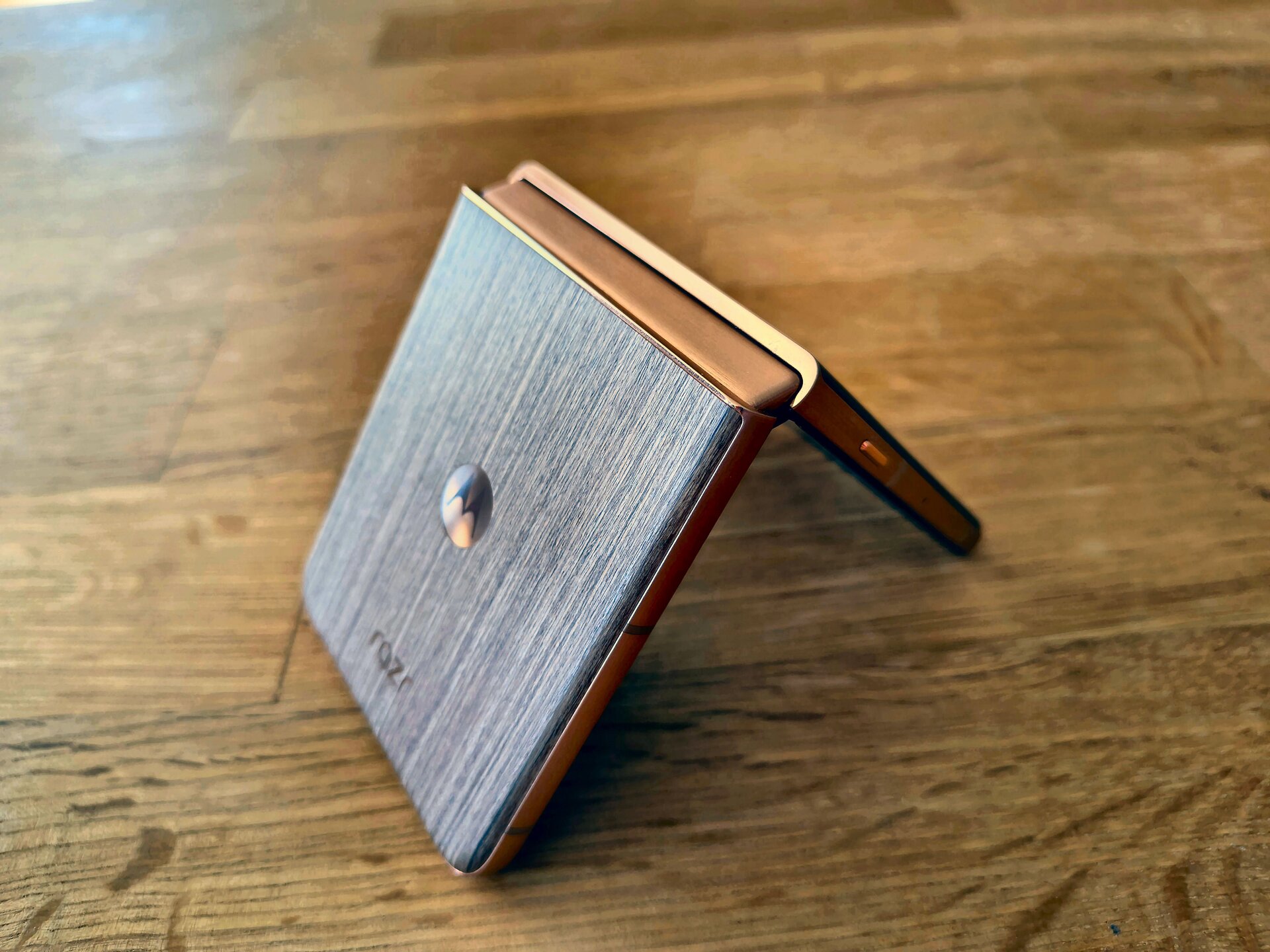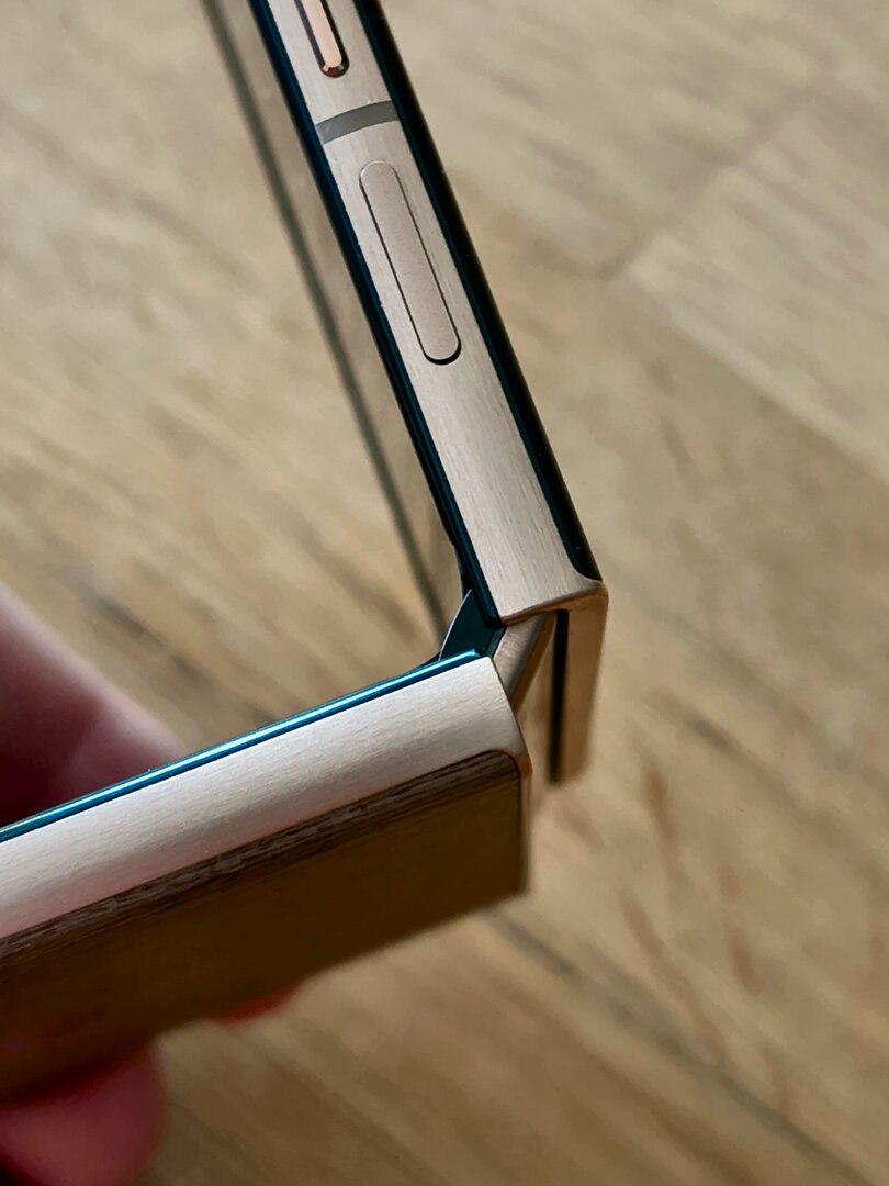 Die durch das bessere / höhere IP-Rating vorherrschende Vermutung einer mindestens guten oder gar hervorragenden Verarbeitung und Wertigkeit des RAZR 60 Ultra konnte ich während meines Tests recht zügig bestätigen. Bereits bei der ersten Entnahme aus dem Karton machte das Gerät haptisch und optisch einen sehr guten und wertigen Eindruck. Das Farbenspiel aus den Glas-, Metall- und Holzelementen meines RAZR 60 Ultra vermittelt nicht nur eine sehr edle und hochwertige Optik – das Gerät fühlt sich glücklicherweise auch genauso an. Gut – bei einer UVP im vierstelligen Preisbereich muss es das auch und bei der bisherigen Leistung der Vorgängergeräte hätte mich alles Andere auch gewundert. Beim Klappmechanismus scheint sich in der wahrnehmbaren Praxis nicht allzu viel getan zu haben, dieser kommt gewohnt „stramm“ und präzise daher. Sicherlich hat Motorola hier im Detail wieder Optimierungen vorgenommen – sei es am Mechanismus selbst oder an einzelnen Materialbestandteilen. Für mich zählt in der Praxis die Performance der Scharniere und die ist auf einem absoluten Oberklasseniveau. Mit etwas Übung bekommt man es hin, das Gerät einhändig zu öffnen; ein einhändiges Schließen dürfte für die meisten Nutzer überhaupt kein Problem sein. Sehr angenehm ist die Tatsache, dass sich der Öffnungswinkel des RAZR 60 Ultra quasi vollständig flexibel vom Nutzer anpassen lässt: Egal ob man das Gerät also bspw. im Kameramodus in „Camcorder-Manier“ hält oder es bspw. in „Zeltform“ auf dem Tisch stehen hat: Der Öffnungswinkel wird stabil gehalten und man muss sich keine unnötigen Gedanken machen, ob das Gerät nun im nächsten Moment vielleicht „zuschnappen“ könnte.