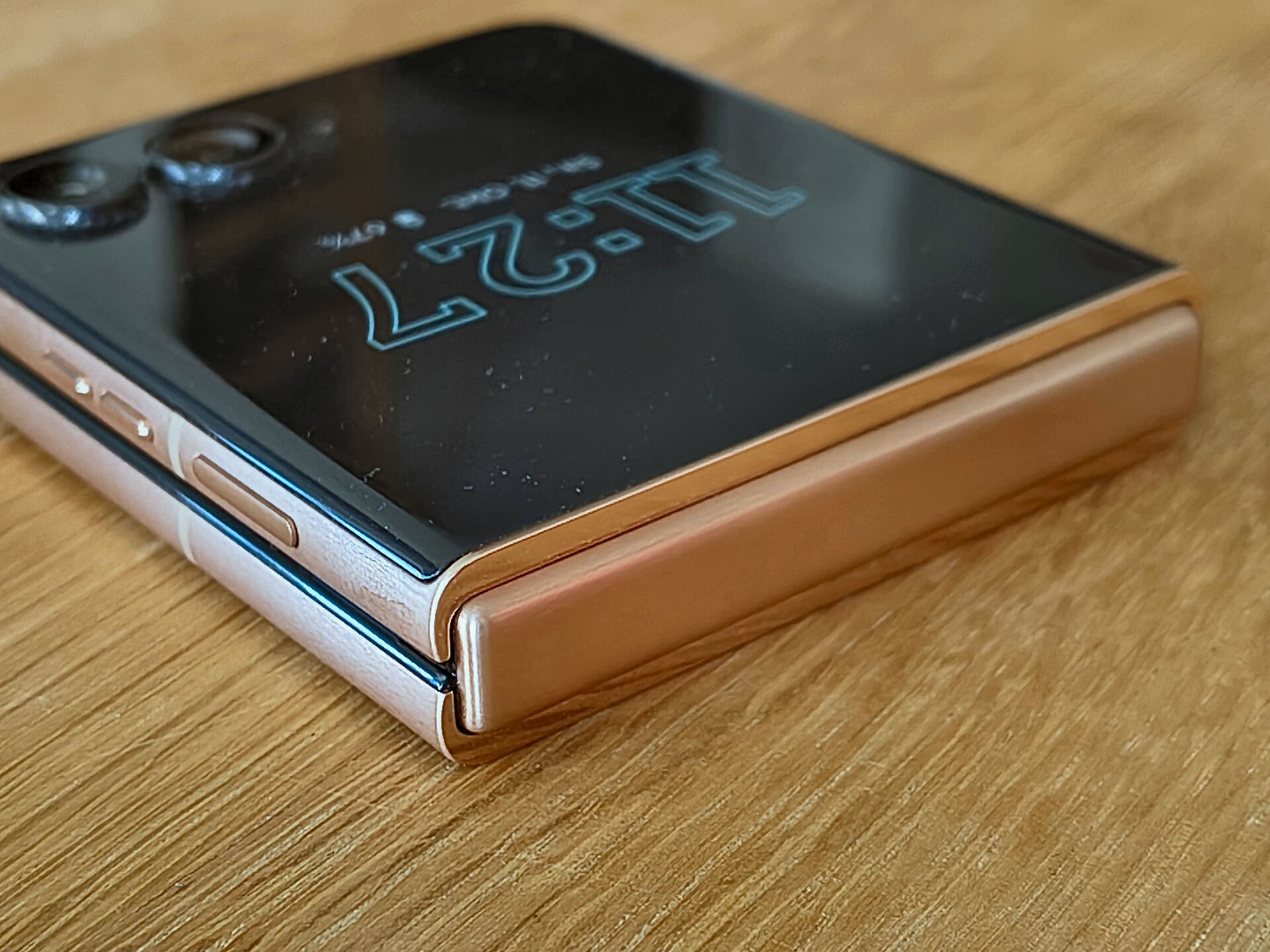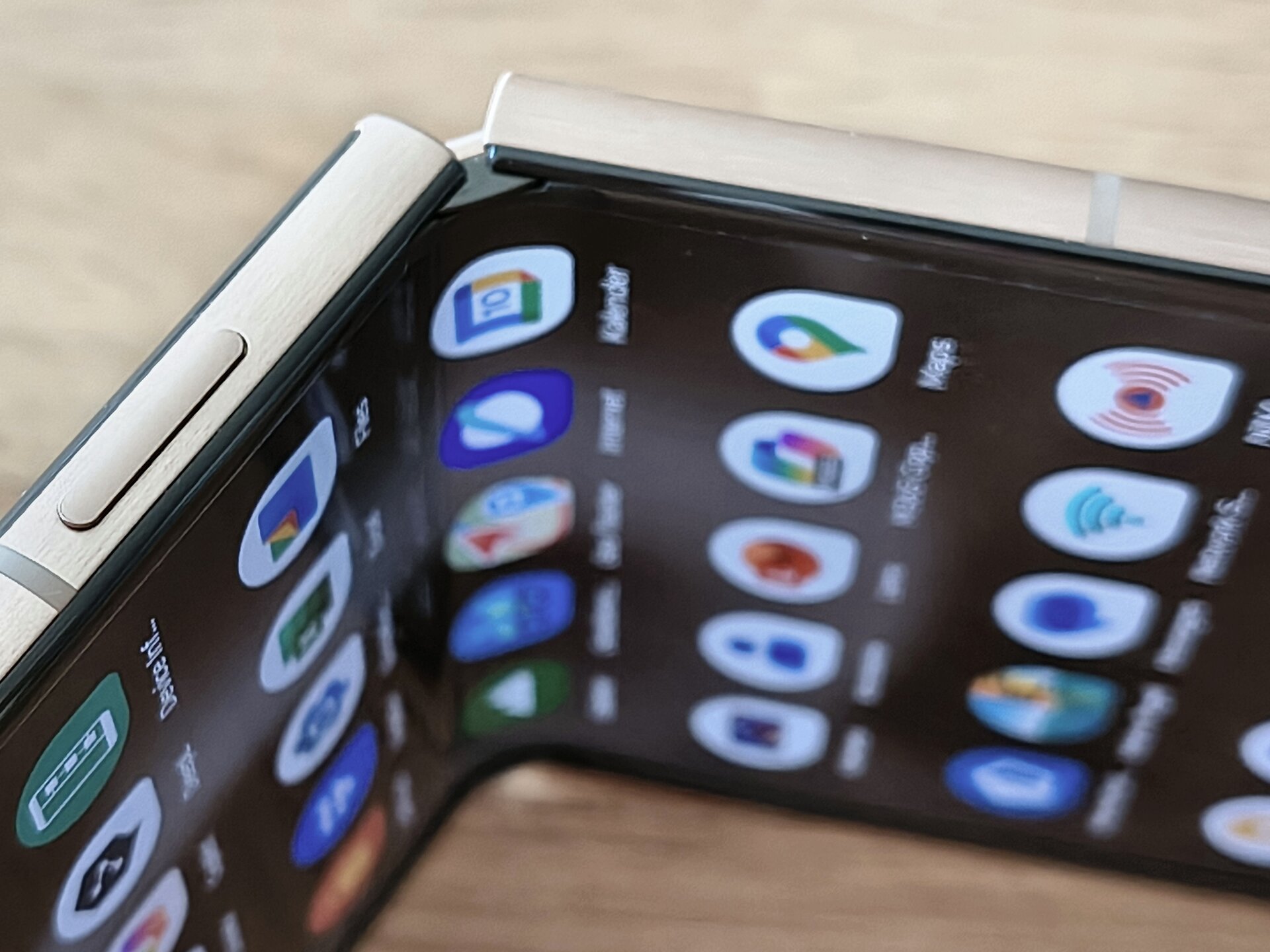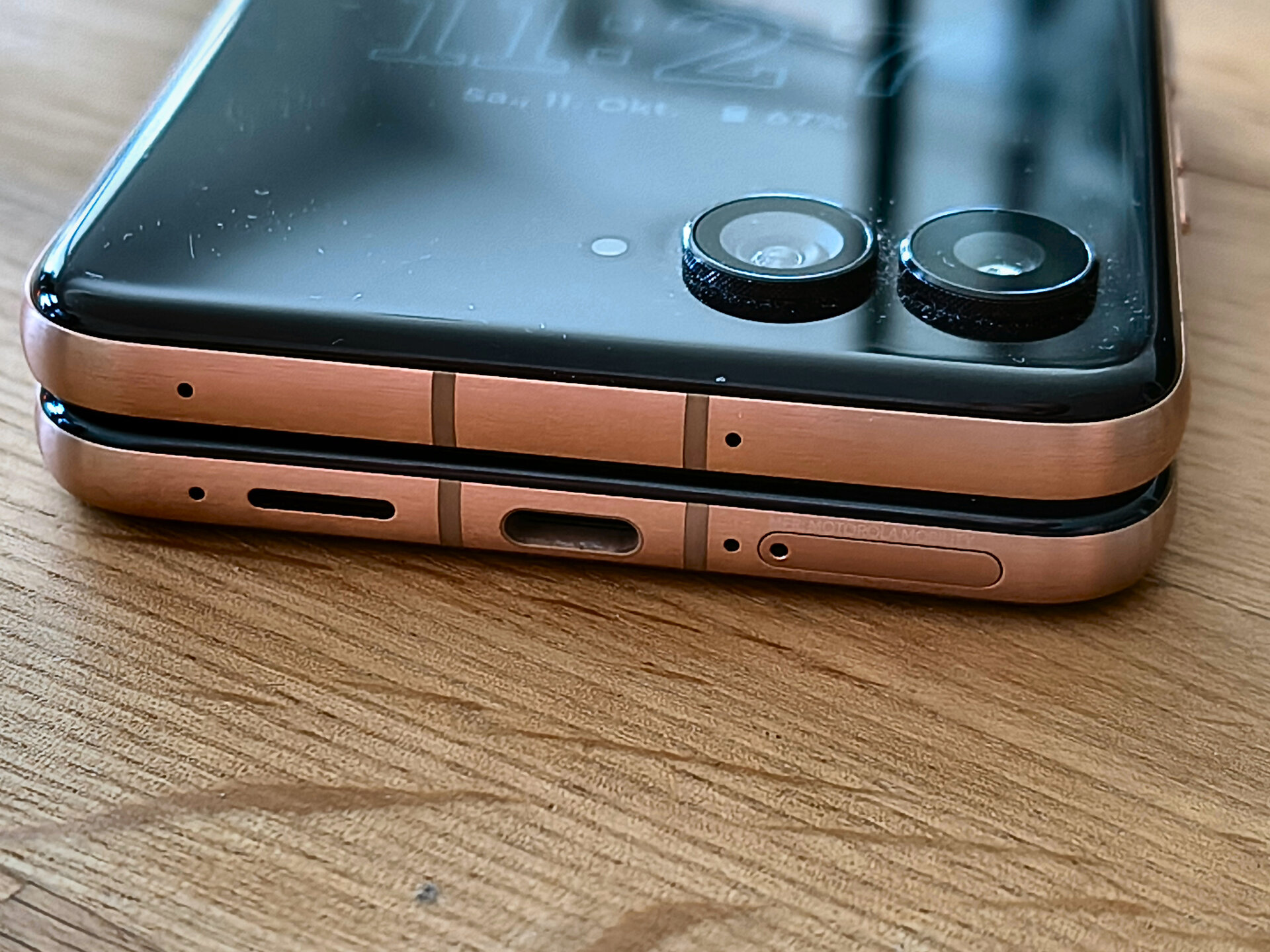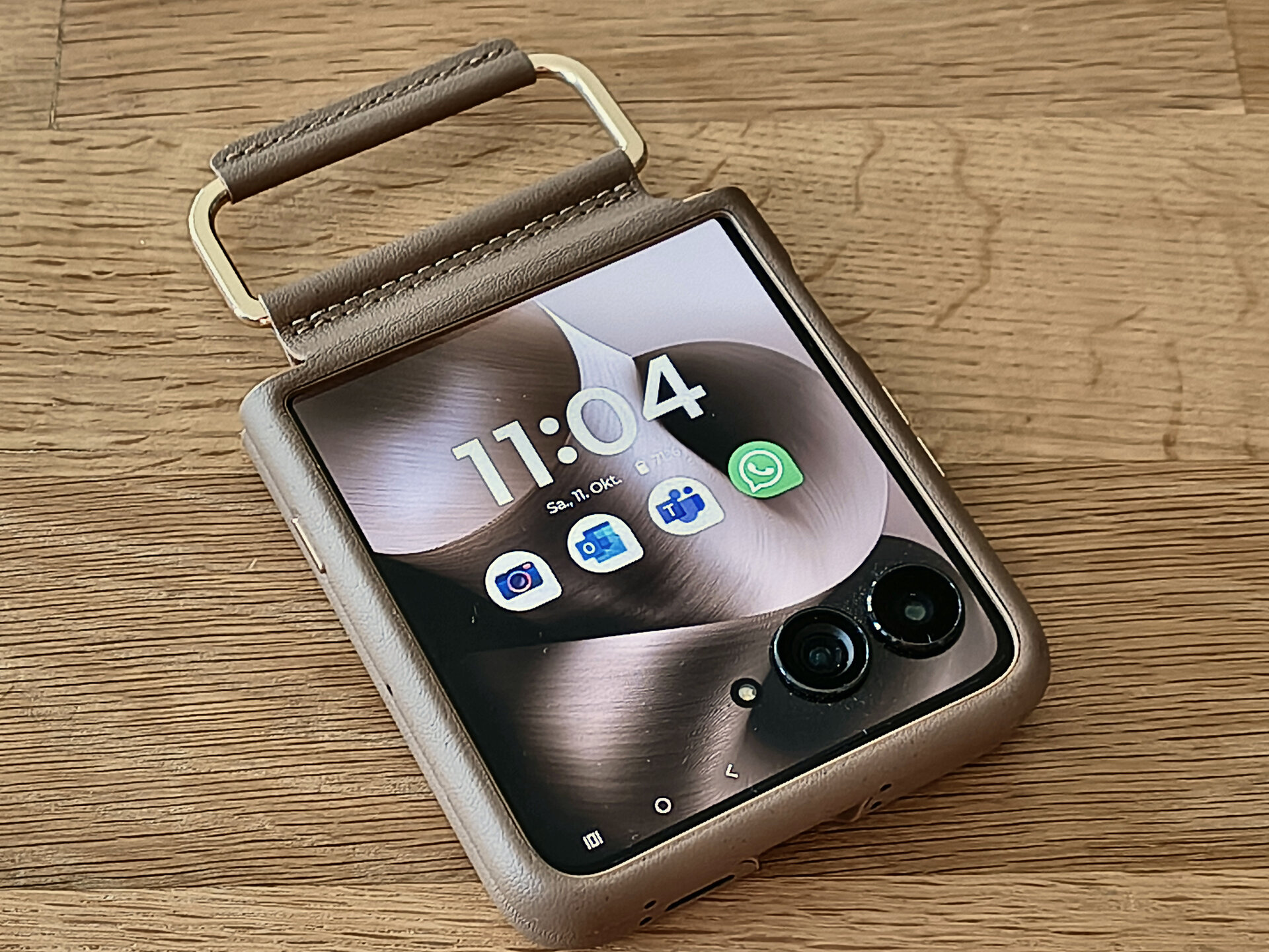 Die durch das bessere / höhere IP-Rating vorherrschende Vermutung einer mindestens guten oder gar hervorragenden Verarbeitung und Wertigkeit des RAZR 60 Ultra konnte ich während meines Tests recht zügig bestätigen. Bereits bei der ersten Entnahme aus dem Karton machte das Gerät haptisch und optisch einen sehr guten und wertigen Eindruck. Das Farbenspiel aus den Glas-, Metall- und Holzelementen meines RAZR 60 Ultra vermittelt nicht nur eine sehr edle und hochwertige Optik – das Gerät fühlt sich glücklicherweise auch genauso an. Gut – bei einer UVP im vierstelligen Preisbereich muss es das auch und bei der bisherigen Leistung der Vorgängergeräte hätte mich alles Andere auch gewundert. Beim Klappmechanismus scheint sich in der wahrnehmbaren Praxis nicht allzu viel getan zu haben, dieser kommt gewohnt „stramm“ und präzise daher. Sicherlich hat Motorola hier im Detail wieder Optimierungen vorgenommen – sei es am Mechanismus selbst oder an einzelnen Materialbestandteilen. Für mich zählt in der Praxis die Performance der Scharniere und die ist auf einem absoluten Oberklasseniveau. Mit etwas Übung bekommt man es hin, das Gerät einhändig zu öffnen; ein einhändiges Schließen dürfte für die meisten Nutzer überhaupt kein Problem sein. Sehr angenehm ist die Tatsache, dass sich der Öffnungswinkel des RAZR 60 Ultra quasi vollständig flexibel vom Nutzer anpassen lässt: Egal ob man das Gerät also bspw. im Kameramodus in „Camcorder-Manier“ hält oder es bspw. in „Zeltform“ auf dem Tisch stehen hat: Der Öffnungswinkel wird stabil gehalten und man muss sich keine unnötigen Gedanken machen, ob das Gerät nun im nächsten Moment vielleicht „zuschnappen“ könnte.