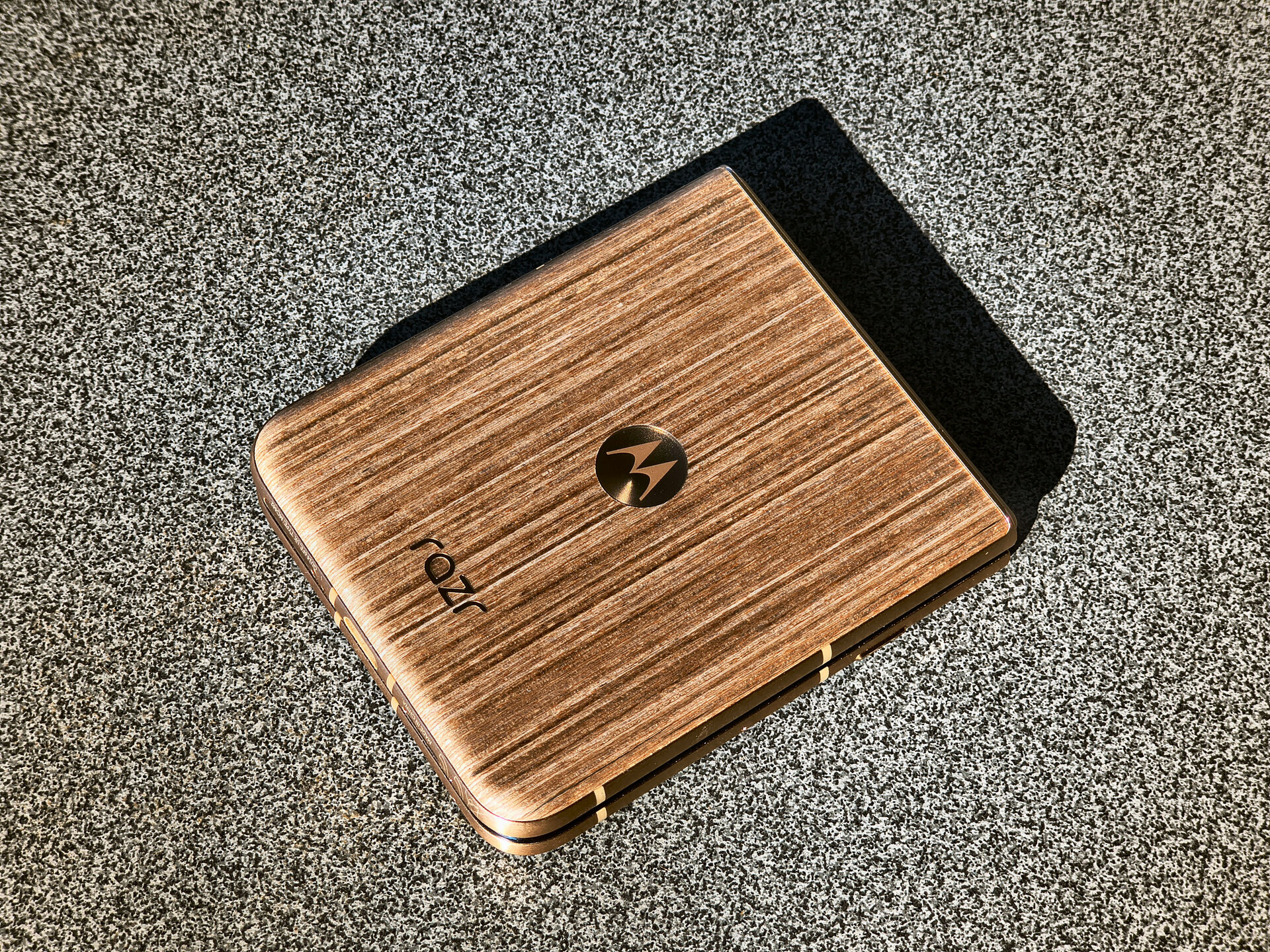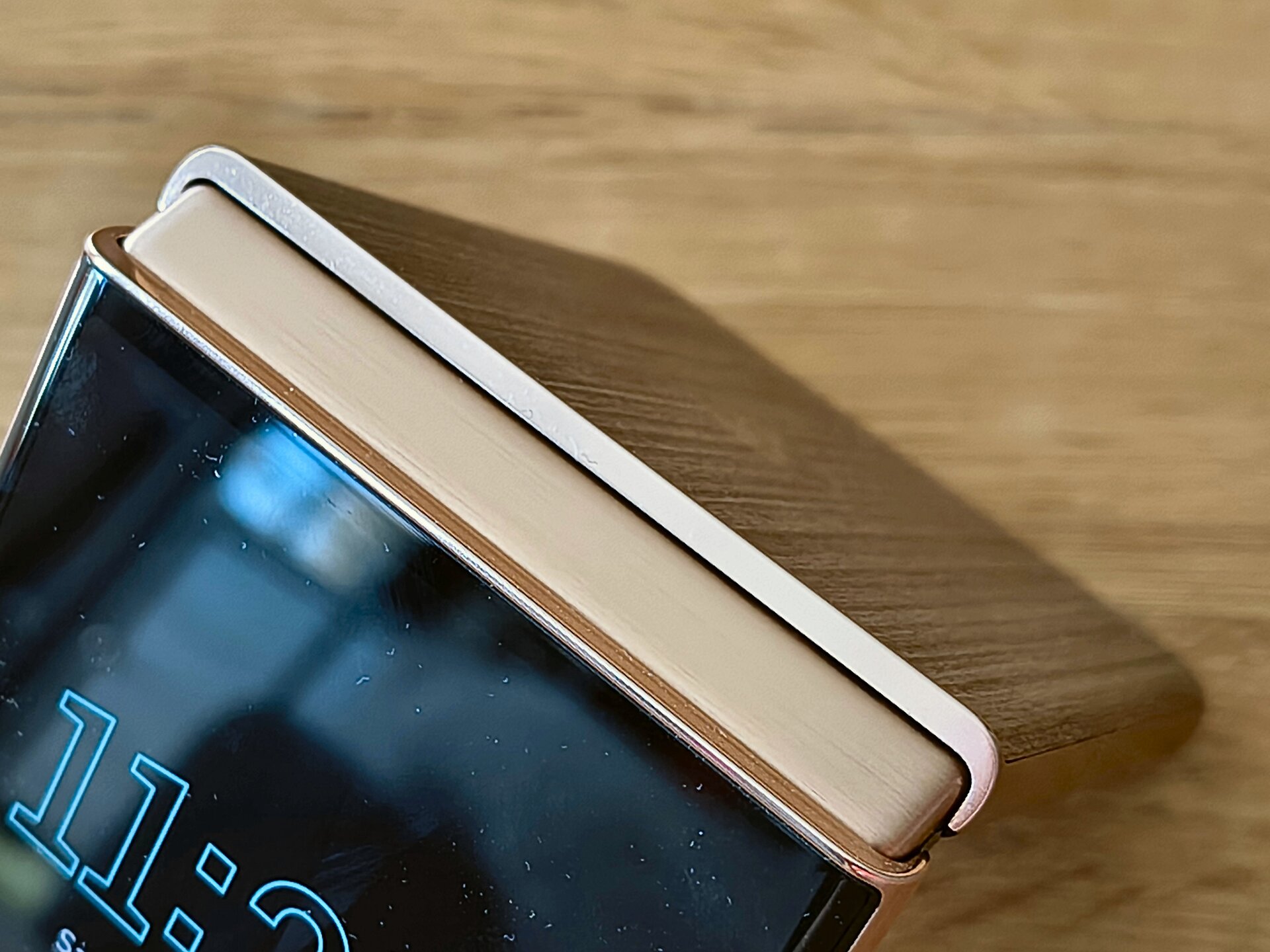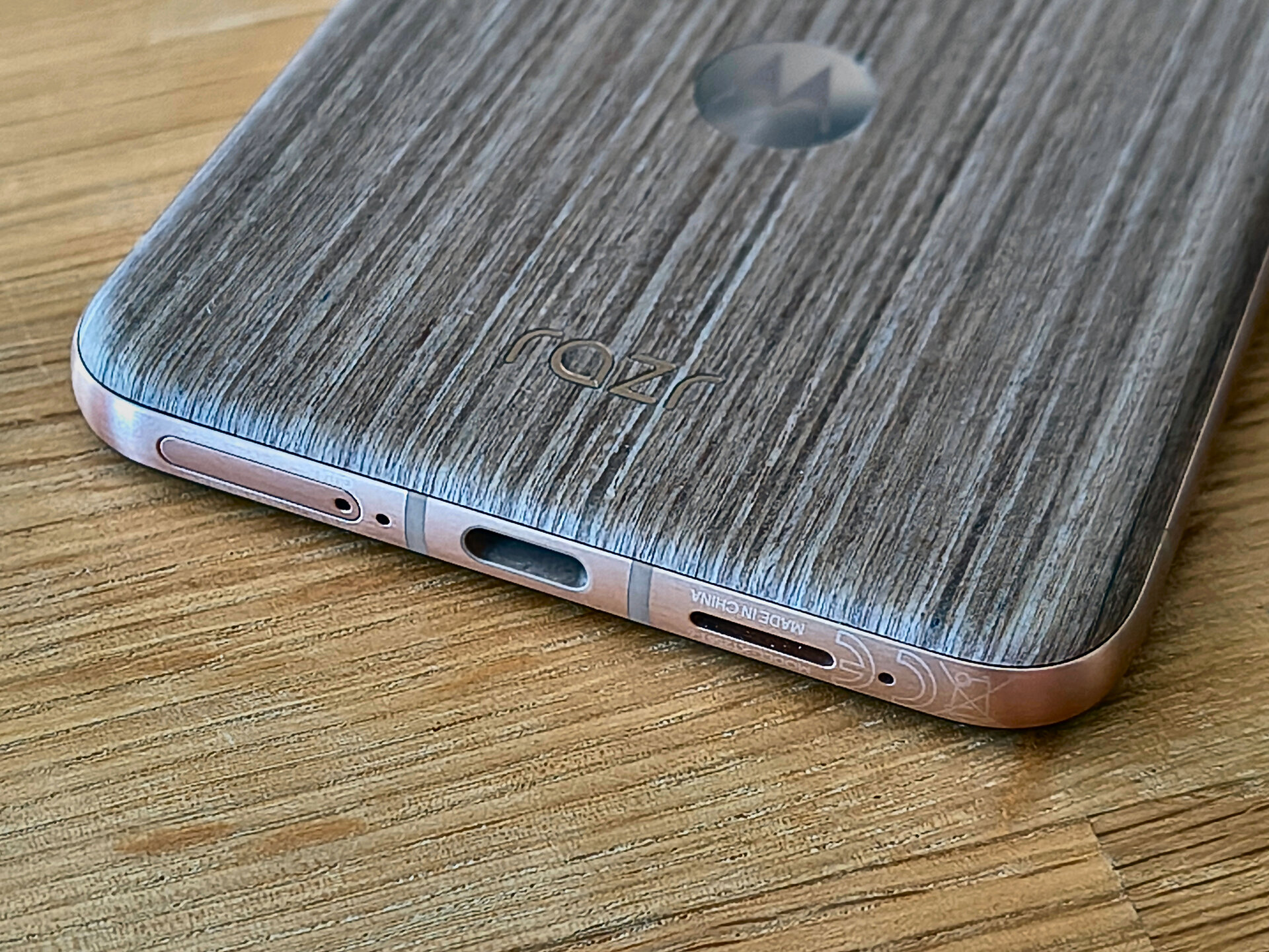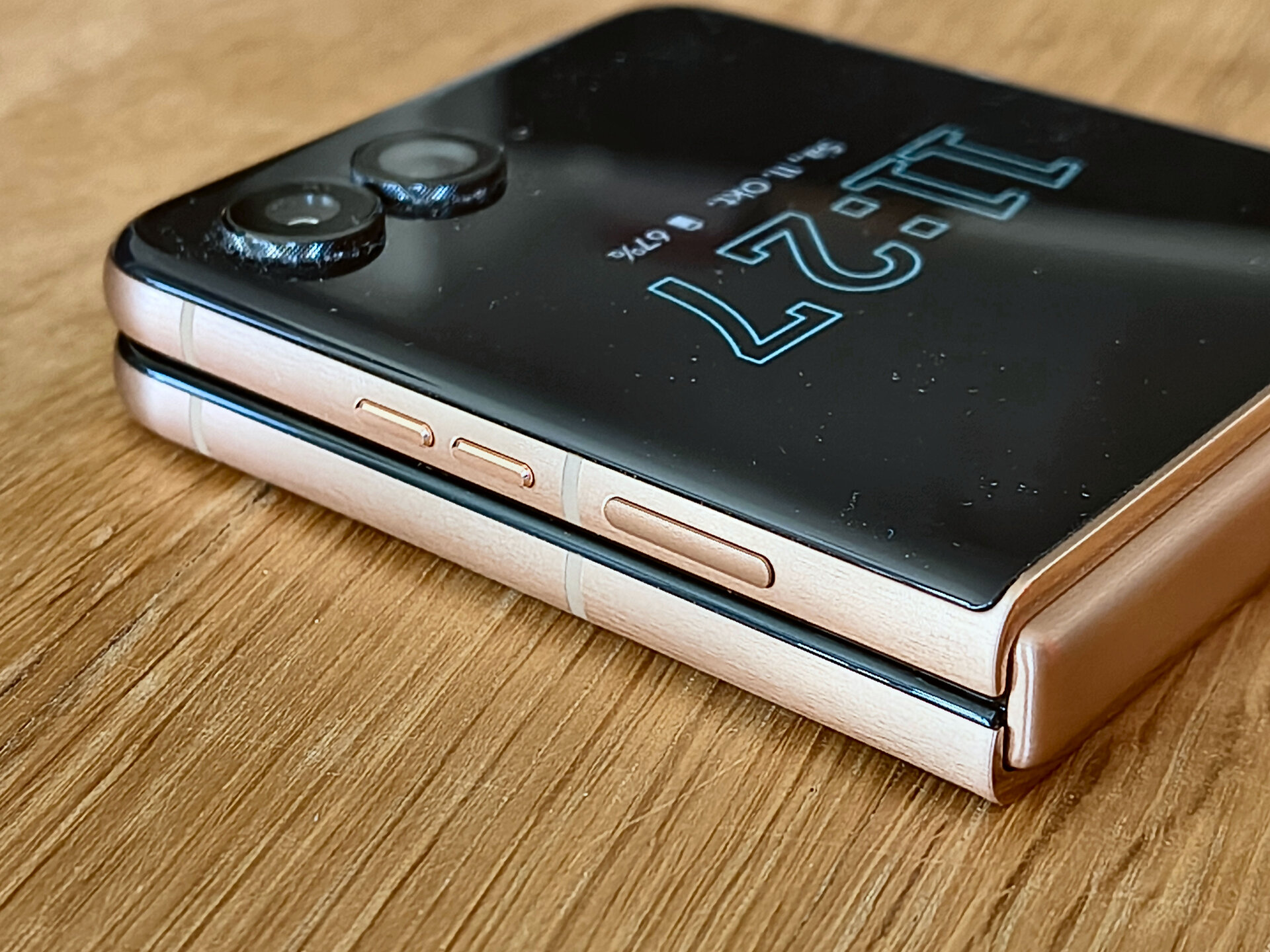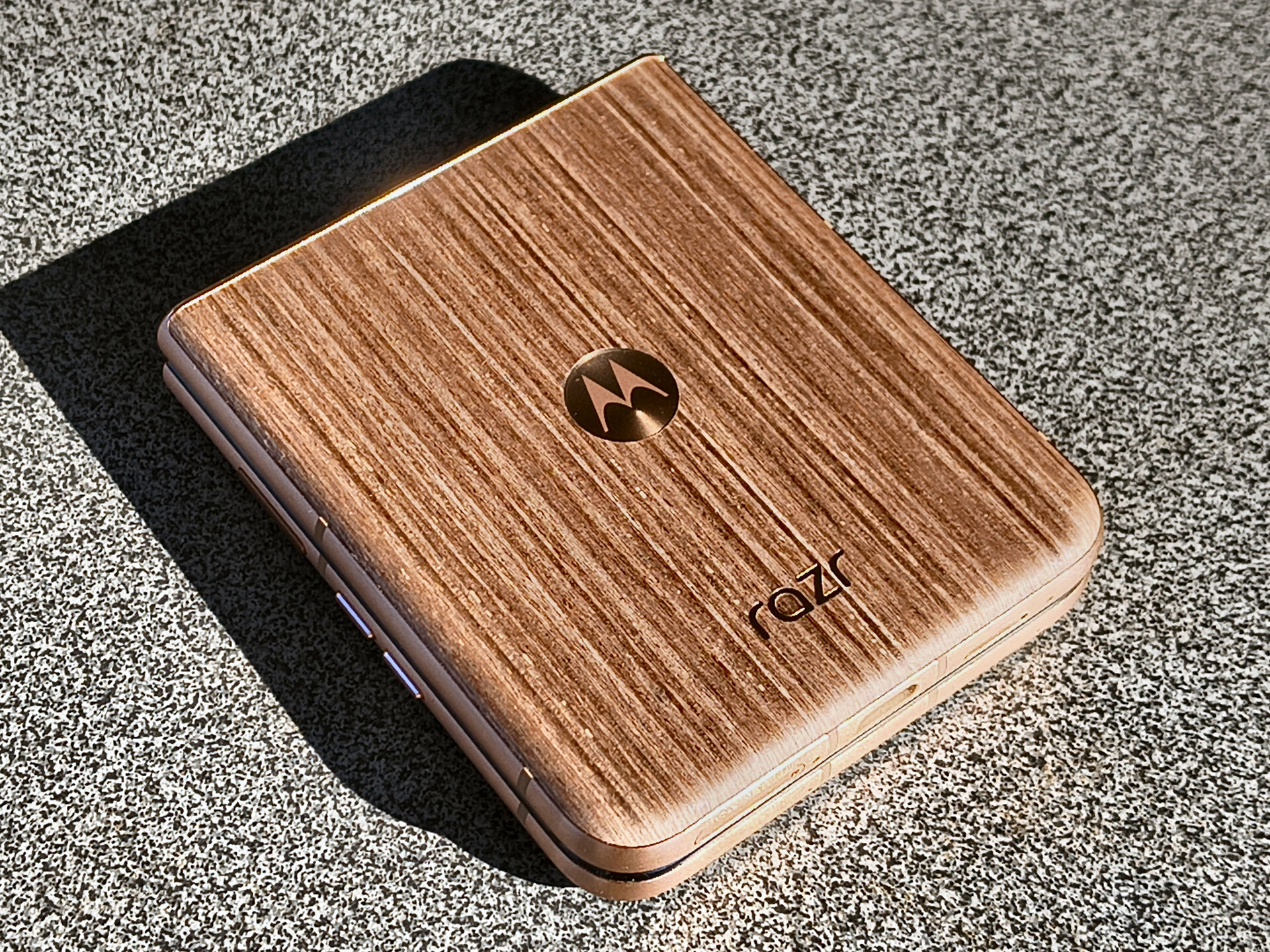Die durch das bessere / höhere IP-Rating vorherrschende Vermutung einer mindestens guten oder gar hervorragenden Verarbeitung und Wertigkeit des RAZR 60 Ultra konnte ich während meines Tests recht zügig bestätigen. Bereits bei der ersten Entnahme aus dem Karton machte das Gerät haptisch und optisch einen sehr guten und wertigen Eindruck. Das Farbenspiel aus den Glas-, Metall- und Holzelementen meines RAZR 60 Ultra vermittelt nicht nur eine sehr edle und hochwertige Optik – das Gerät fühlt sich glücklicherweise auch genauso an. Gut – bei einer UVP im vierstelligen Preisbereich muss es das auch und bei der bisherigen Leistung der Vorgängergeräte hätte mich alles Andere auch gewundert. Beim Klappmechanismus scheint sich in der wahrnehmbaren Praxis nicht allzu viel getan zu haben, dieser kommt gewohnt „stramm“ und präzise daher. Sicherlich hat Motorola hier im Detail wieder Optimierungen vorgenommen – sei es am Mechanismus selbst oder an einzelnen Materialbestandteilen. Für mich zählt in der Praxis die Performance der Scharniere und die ist auf einem absoluten Oberklasseniveau. Mit etwas Übung bekommt man es hin, das Gerät einhändig zu öffnen; ein einhändiges Schließen dürfte für die meisten Nutzer überhaupt kein Problem sein. Sehr angenehm ist die Tatsache, dass sich der Öffnungswinkel des RAZR 60 Ultra quasi vollständig flexibel vom Nutzer anpassen lässt: Egal ob man das Gerät also bspw. im Kameramodus in „Camcorder-Manier“ hält oder es bspw. in „Zeltform“ auf dem Tisch stehen hat: Der Öffnungswinkel wird stabil gehalten und man muss sich keine unnötigen Gedanken machen, ob das Gerät nun im nächsten Moment vielleicht „zuschnappen“ könnte.