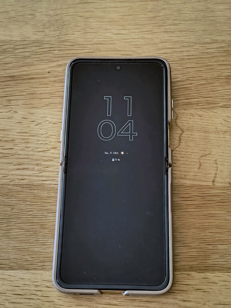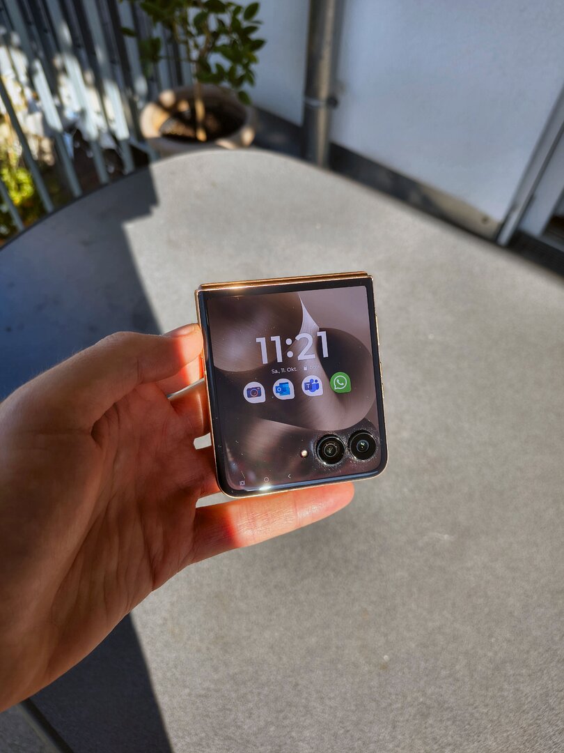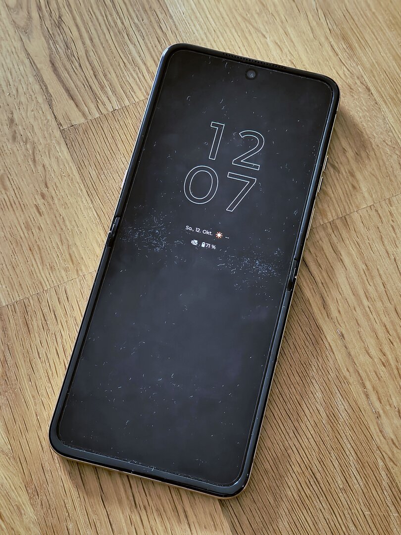 Noch ein paar Worte zum Scharnier bzw. zur Ausgestaltung der „Knickfalte“ beim RAZR 60 Ultra: Einen wirklichen Fortschritt gegenüber dem RAZR 50 Ultra kann ich hier mit bloßem Auge nicht feststellen, was allerdings nicht zwingend negativ behaftet sein muss. Schon das Vorgängermodell hatte eine recht schwach ausgeprägte Falte in der Mitte des Displays, welche eigentlich nur bei genauem Blick auf die Stelle oder aber beim Drüberfahren mit dem Finger sicht- bzw. spürbar war. Kommt man bspw. während dem Scrollen auf dem Display über die Falte nimmt man diese zwar leicht wahr – wirklich „stören“ im Sinne von „negativ auffallen“ tut sie aber nicht. Ich bin hier der Ansicht, dass man sich diesem Kompromiss hingeben muss, wenn man sich auf den stylischen Formfaktor einlassen möchte. Diesem Umstand sollte man sich vor dem Kauf bewusst sein – dann dürfte hier auch kein böses Erwachen folgen. Ebenfalls positiv eingestellt bin ich hinsichtlich der Haltbarkeit der Knick-Displays. Ja, hin und wieder ließt man online mal von (Total-) Ausfällen beim Display die, je nach Hersteller, mal mehr oder weniger gut auf Kulanz bzw. Garantie abgewickelt werden. Im Großen und Ganzen dürfte aber die Fallzahl der defekten Geräte bzw. Displays in Relation zu den verkauften Einheiten immer noch eher gering sein. Und dass ein knickbares Panel grundsätzlich anfälliger ist als ein formstabiles Panel, sollte auch klar sein. Bedenkt man des Weiteren die Tatsache, dass sich das RAZR 60 Ultra ebenfalls wieder nahezu vollständig in geschlossenem Zustand nutzen lässt, minimiert das natürlich wieder die Faltvorgänge des Displays. Ob eine dauerhafte Nutzung bzw. Lagerung in geknicktem Zustand förderlich ist… vermutlich auch eher weniger. Letztlich muss man sich von diesen Sorgen lösen, wenn man den vollen Nutzen und die vollständige Bedienfreunde am Gerät bekommen möchte. Wichtig ist und bleibt vor allem eines: NIEMALS eigenverantwortlich die Schutzfolie des Innen- bzw. Hauptdisplays entfernen und – trotz IP-Schutzklasse – auf das Smartphone achtgeben. Und sollte es tatsächlich mal zu einem Defekt kommen: Kontakt mit dem Hersteller aufnehmen und nicht versuchen, selbst Hand an zu legen oder irgendwelche Hinterhof-Werkstätten zu beauftragen.