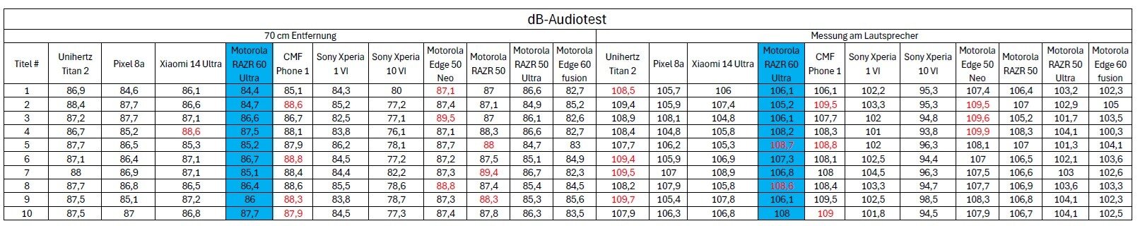 Nachfolgend findet Ihr noch die ermittelten dB-Werte des RAZR 60 Ultra. Gemessen wurde jeweils immer in zwei Modi bzw. Situationen: Messwert 1 stellt die maximale Lautstärke in einem Abstand von 70 cm von dB-Messinstrument bis zum Hauptlautsprecher des Smartphones dar. Messwert 2 gibt die Messung direkt am Hauptlautsprecher mit wenigen Millimetern Abstand wieder. Betrachtet wurde in beiden Szenarien in Summe 10 Audio-Files, welche identisch über einen Zeitraum von jeweils 25 Sekunden wiedergegeben wurden.