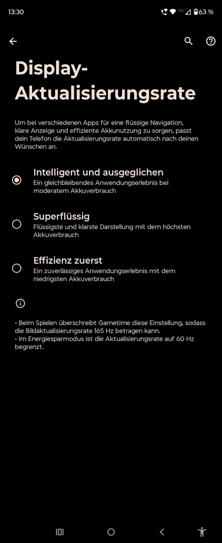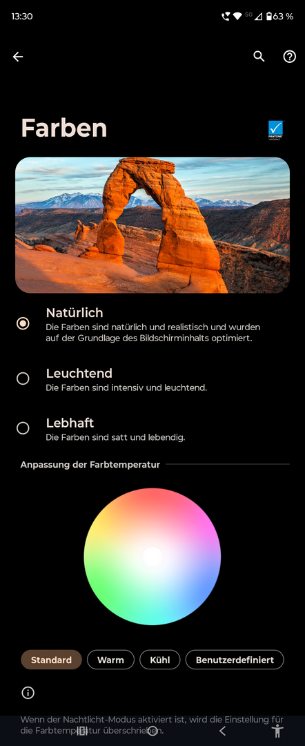 Genau wie schon beim RAZR 50 Ultra sind die Displays auch beim RAZR 60 Ultra zweifelsohne wieder DAS Design- und Komfort-Element schlechthin. Wir starten an dieser Stelle wieder mit dem Hauptbildschirm, welcher mit einer Größe von 7,0“ und einer Auflösung von 2.992 x 1.224 Pixel (Pixeldichte: 464 ppi) wirklich beachtliche Ausmaße im 22:9 Format annimmt. Als Technologie verwendet Motorola hier LTPO AMOLED mit 10-Bit und einer maximalen Bildwiederholrate von 165 Hz, welche in der Praxis aber nur in dafür vorgesehenen Anwendungen (bspw. beim Gaming) in Anspruch genommen werden. Die Bildwiederholrate kann selbstverständlich intelligent vom Smartphone geregelt werden, sodass der Nutzer in der Praxis nahezu keine Beeinträchtigung wahrnehmen dürfte und darüber hinaus von den energiesparenderen Eigenschaften profitieren dürfte. Die Spitzenhelligkeit des Displays gibt Motorola mit einem Wert von 4500 Nits an – wenn das Gerät diesen in der Praxis auch nur annähernd erreicht, mache ich mir hier im Hinblick auf die Ablesbarkeit des Bildschirms überhaupt keine Sorgen; das hat schon beim Vorgänger einwandfrei funktioniert. Wer mit der Standard-Konfiguration des Displays noch nicht 100%ig glücklich ist, hat auch beim RAZR 60 Ultra wieder die Chance, sich die eigenen Einstellungen bspw. mittels der Farbprofile und deren tiefergehenden Einstellungsmöglichkeiten zurecht zu pimpen. Neben den drei vorgegebenen Profilen "Natürlich", "Leuchtend" und "Lebhaft" kann die Farbtemperatur darüber hinaus auch noch mittels den Modi Standard / Warm und Kühl festgelegt werden. Wer hier immer noch nicht zu einer zufriedenstellenden Lösung gekommen ist, kann mit der benutzerdefinierten Einstellungsmöglichkeit nochmal weiteres Feintuning betreiben.