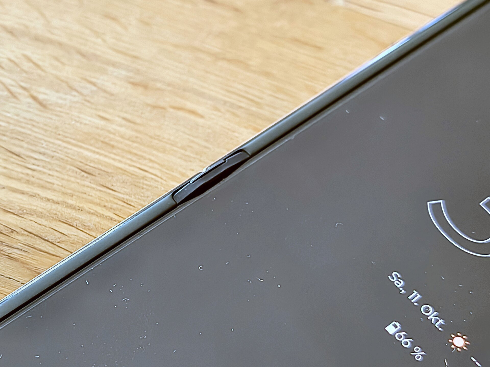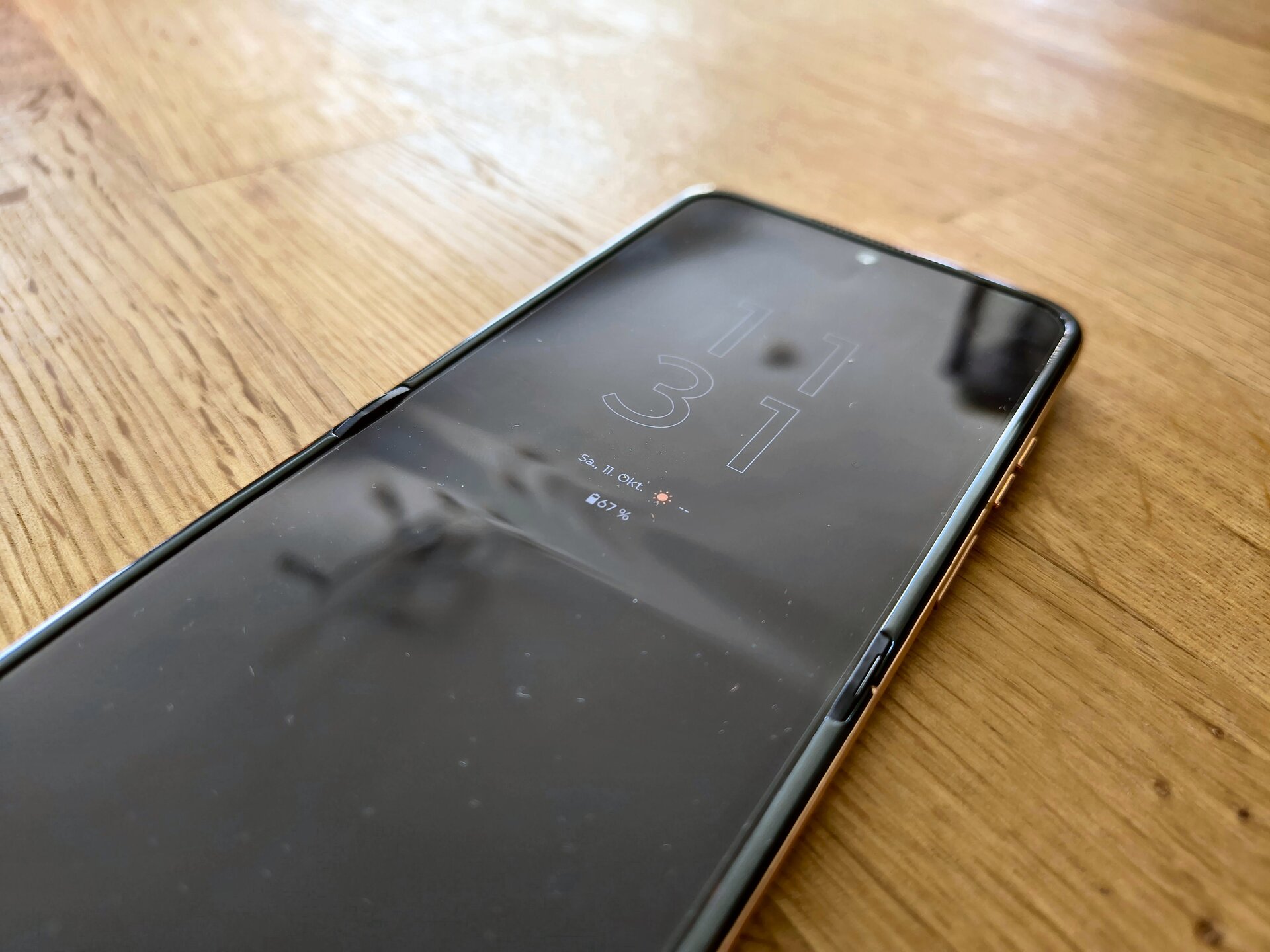 Wenn wir das Gerät nun öffnen, finden wir – neben dem riesigen Hauptdisplay – oben mittig die Selfie-Kamera im Punch-Hole Stil platziert, darüber die Hörmuschel bzw. der zweite Lautsprecher zur Medienwiedergabe. Im linken Eck des Displays befindet sich der zweite Umgebungslichtsensor – quasi unsichtbar für den Nutzer, selbst bei genauer Betrachtung.