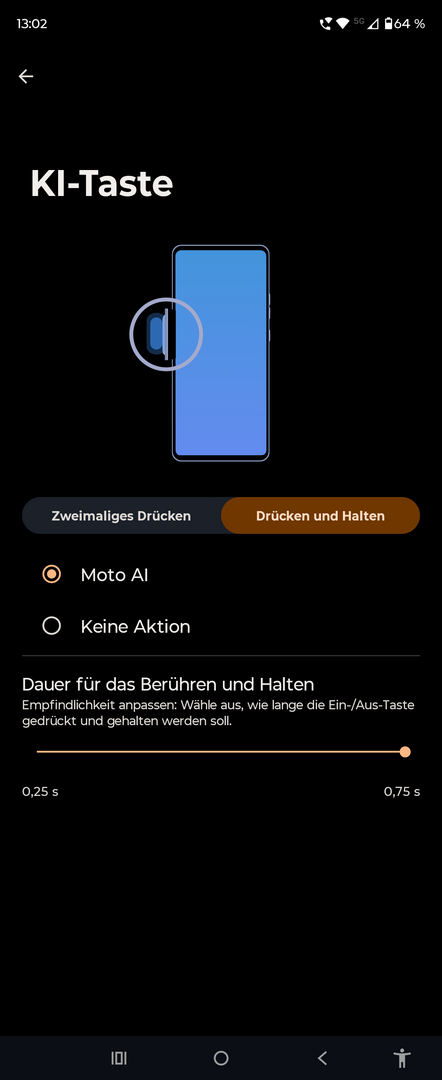 Ebenso ins positive Gesamtbild fügen sich die Bedienelemente des Geräts ein, welche konkret aus einer Lautstärkewippe (streng genommen sind es zwei separate Tasten), einem Power-Button mit integriertem Fingerabdruckscanner und einer KI-Taste bestehen. Der Power-Button ist – aufgrund seiner Funktionalität als Fingerabdruckscanner – etwas flacher und breiter gehalten; die anderen Tasten sind sehr schmal und dafür in der Bauhöhe etwas erhabener. Hierdurch stellt Motorola zudem sicher, dass der Nutzer die Tasten auch blind problemlos bedienen und erfühlen kann. Der Druckpunkt ist bei allen genannten Tasten präzise und gut ausgeprägt.