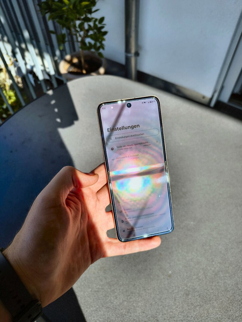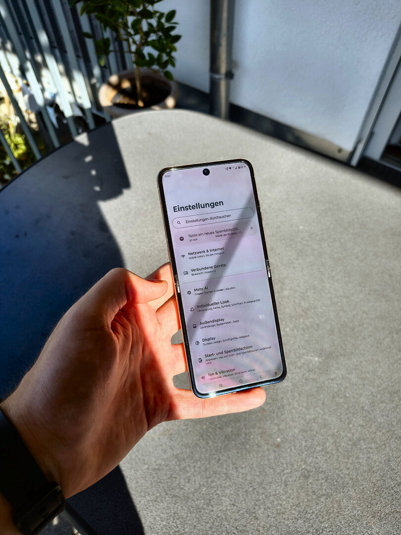- Auch beim Innendisplay hat Motorola Hand angelegt und einerseits die Größe erhöht und auch bei der maximalen Helligkeit nochmal Hand angelegt: Auch bei direkter Sonneneinstrahlung ist die Ablesbarkeit überhaupt kein Problem, die Knickfalte lässt sich natürlich nicht vollständig „ausblenden“; fällt aber nach kurzer Eingewöhnung kaum mehr auf.