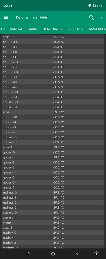 Zur Einordnung zwecks Temperatur: Im „Leerlauf“ bewegt sich die Temperatur der Komponenten des RAZR 60 Ultra im Bereich von knapp 25°C. In der Spitze erreichte das Gerät bei mir nach bereits einem AnTuTu Durchgang Werte bis knapp an die 60°C heran. Das ist ordentlich und durchaus auch mehr, als der große Durchschnitt der Geräte am Markt liefert. Und vor allem sind die Werte des RAZR 60 Ultra deutlich höher, als das beim letztjährigen Flip-Phone Flaggschiff der Fall war. Hier sind Steigerungen im Bereich von +10°C zu verzeichnen.