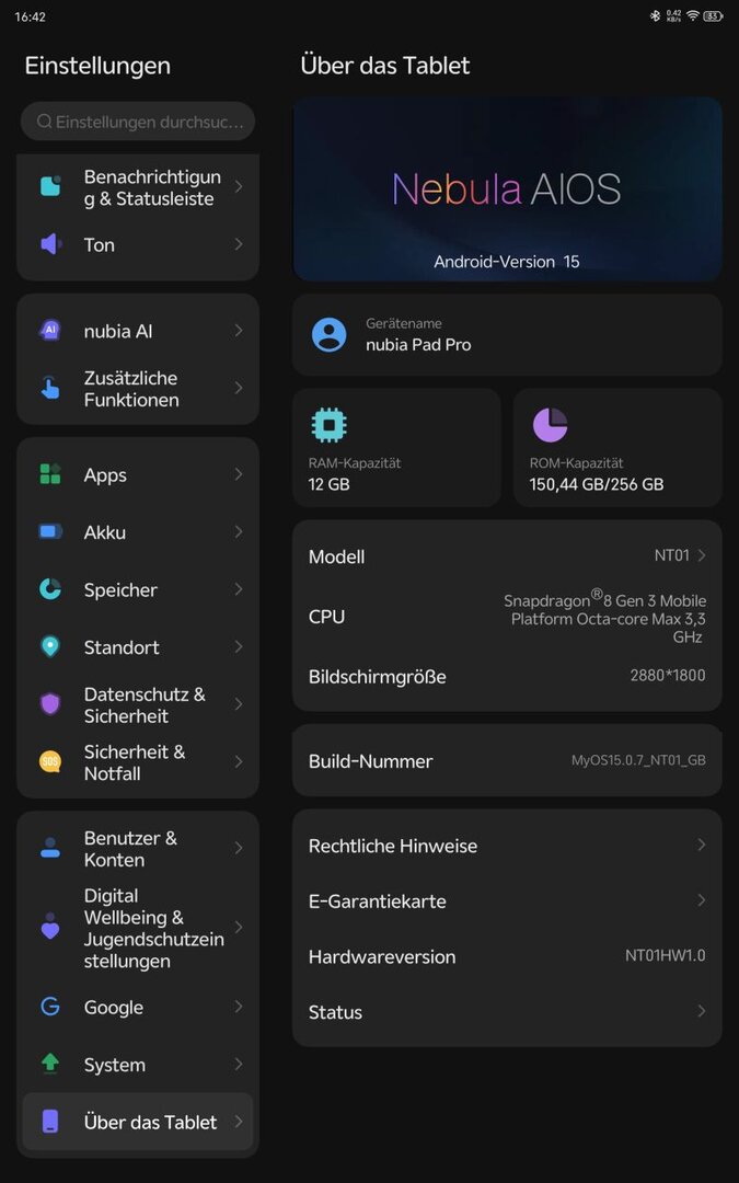 Der Akku des Nubia Pad Pro ist mit riesigen 10.100 mAh dimensioniert und hält im Alltag erstaunlich lange durch. Bei meinem Nutzungsprofil (abends 2-3 Stunden Videos streamen und im Internet surfen) kam ich locker eine Woche ohne Aufladen aus. Nubia selbst gibt eine Standby-Zeit von bis zu 50 Tagen an, was die immense Kapazität unterstreicht. Im PC Mark Battery Test erreichte das Gerät mit 144 Hz Bildwiederholrate und mittlerer Helligkeit eine Laufzeit von 10,25 Stunden. Das ist für die Displaygröße und Leistung mehr als in Ordnung. Obwohl ein leistungsstarkes 80W Netzteil mitgeliefert wird, kann das Tablet "nur" mit bis zu 66W aufgeladen werden. Der Akku benötigt rund eine Stunde, um von 2% auf 100% geladen zu werden, was für die Kapazität sehr schnell ist. Neben dem Netzteil liegt lediglich ein USB-C auf USB-C Kabel bei; eine Displayfolie, wie sie heutzutage oft bei Smartphones üblich ist, fehlt leider.Software und Updates: Optimiertes Android 15 mit Langzeit-Support