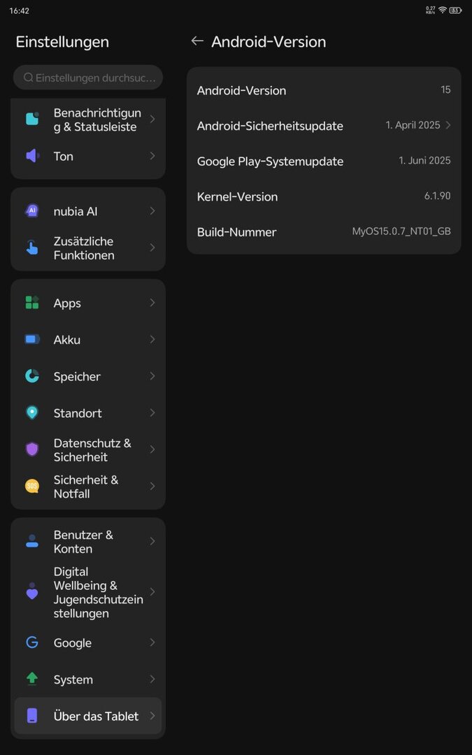 Als Betriebssystem kommt das von Nubia angepasste MyOS 15.0 zum Einsatz, das auf Android 15 basiert. Die Google Security Updates sind auf dem Stand von April 2025. Die Benutzeroberfläche wirkt vertraut, da sie dem REDMAGIC OS 10 (REDMAGIC ist eine eigenständige Tochterfirma von Nubia) ähnelt. Positiv ist, dass ich keine Übersetzungsfehler entdecken konnte. Sogar der nützliche Gamelauncher "Gamespace" ist vorhanden und lässt sich bequem über das Schnellauswahlmenü aufrufen.Nubia gibt für Geräte in der EU und Großbritannien eine Update-Garantie von 3 Jahren für Major Android Updates und 5 Jahre Security Updates. Das ist ein starkes Versprechen und sorgt für eine gute Zukunftssicherheit.