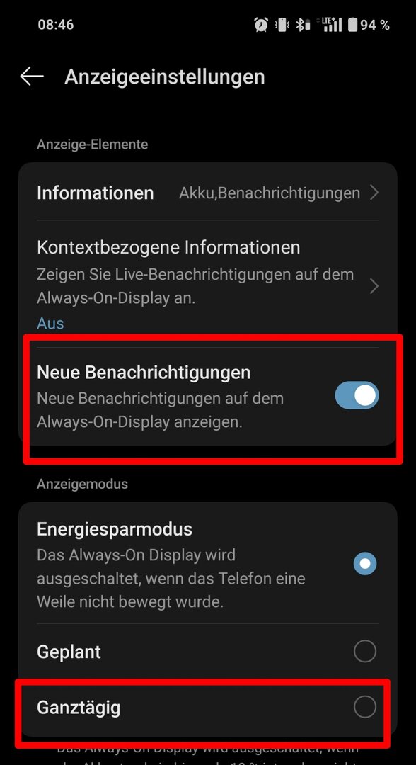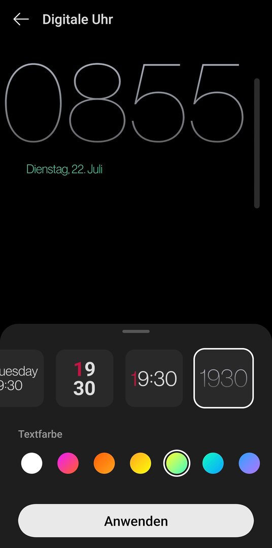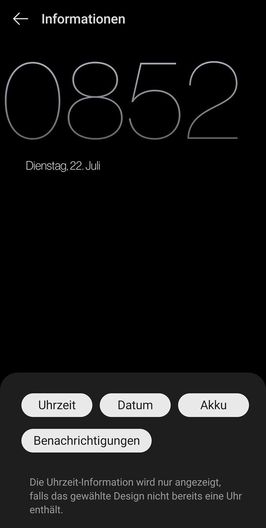 Du bist nicht in den richtigen Einstellungen..Harha schrieb:Die Farbe kann ich nur für das Datum ändern. Akku wird weder in der "Vorschau", noch in im AOD angezeigt. "Schriftart" unter "Hintergründe & Stil" ändert die Größe der Schrift "überall" aber nicht im AOD.