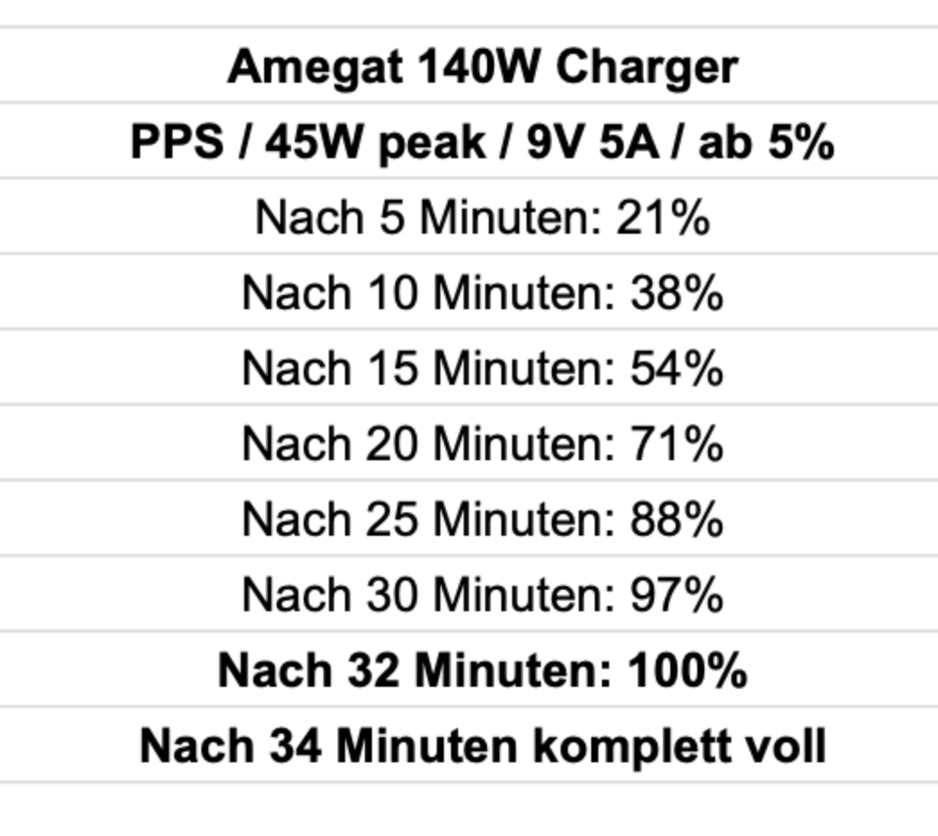 Startet mit 76.8W, nach ner Minute rund 68W. Nach 10 min. von 0% auf 38% und somit 7 bzw. 9% schneller als mit einem 45W PD Netzteil und 3m. Kabel.