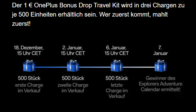 nachdem ich heute morgen die Infos zum Launch des OnePlus 13 etwas durcheinander gebracht habe, habe ich mich nun noch einmal genauer mit dem OnePlus Bonus Drop Travel Kit beschäftigt - das Kit besteht aus Kappe, Kulturbeutel und Kaffeebecher und es ist gerade einmal für 1 EUR zu haben!