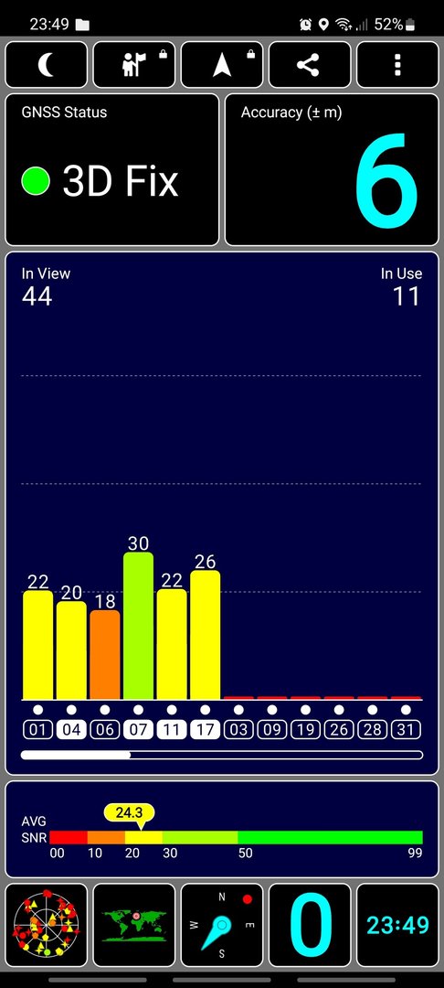 Ich habe gerade GPS Test (die app) geladen und ausprobiert (sieht von den bilden aus wie die, die du benutzt. Nach zwei Sekunden hatte ich 69 in view und 29 in use bei 3m Genauigkeit.