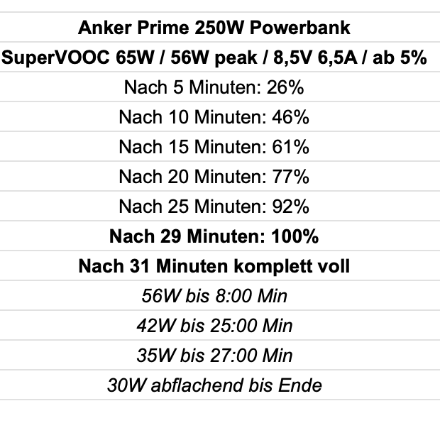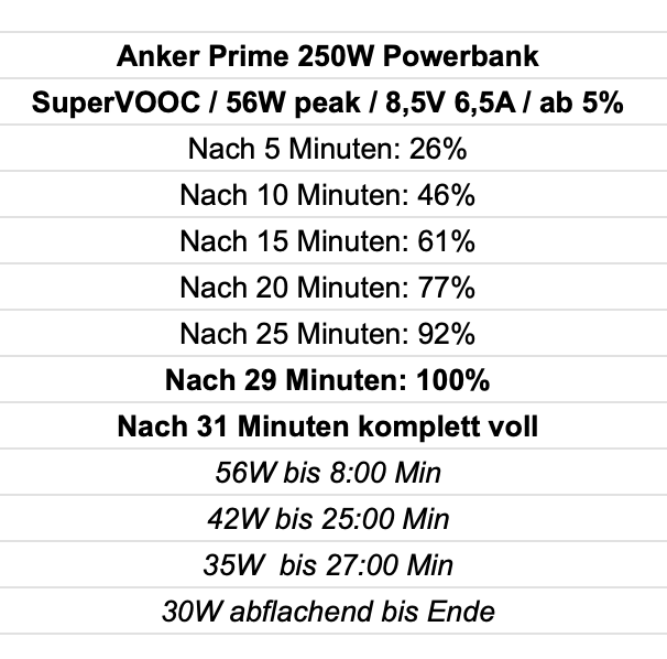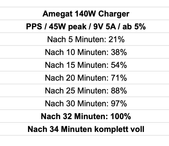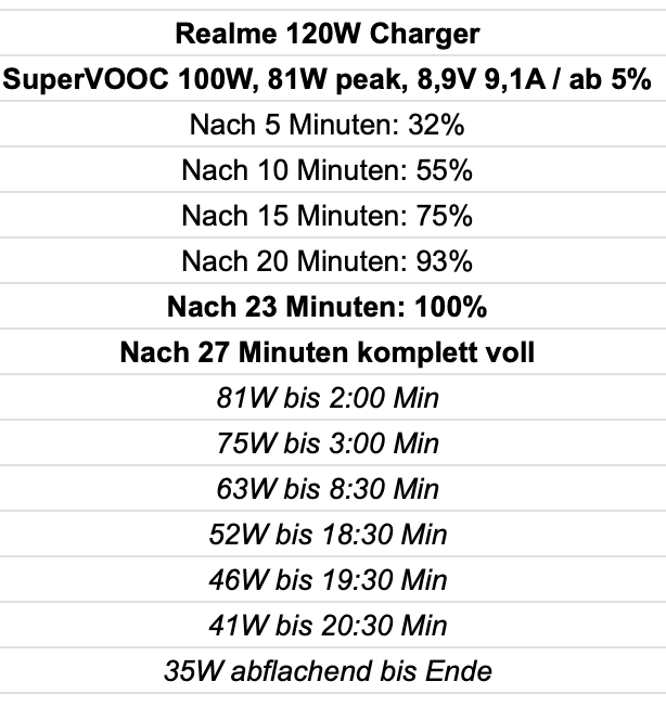 Das macht Xiaomi ganz ähnlich. Da wird auch mit 120W HyperCharge geworben, 20V 6A, aber die Spannung beim Laden ist immer geringer, in der Realität sind es um die 100W. Natürlich kommt da noch hinzu, dass da mit auch nur 1-2 Minuten geladen wird, aber soweit so bekannt.